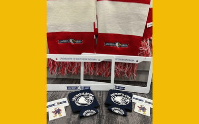 Value $50. Archies' Army swag: scarves, mugs, magnets, license plate frames, and koozies. Donated by USI's Athletic Department.