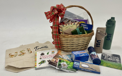 Value $ . Basket donated by the USI Trails Coalition. Portable hot/cold drink containers, canvas bag, informational guides on plants, animals and the history of the coalition, hand-held magnifier, personal guide through USI trails