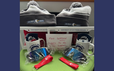 Value $500. Two (2) Season tickets to the Men's & Women's basketball season. Section 103, Row J, Seats 5 & 6, plus two (2) of each of the following swag items: license plate frames, scarves, winter hats, coffee mugs, magnets, key chains, and temporary tattoos. Donated by USI's Athletic Department.