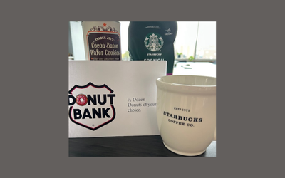 Value $25. Enjoy this coffee break with French Roast Starbucks coffee in a Starbucks mug alongside Trader Joe's Wafer Cookies AND 1/2 dozen donuts from the Donut Bank.