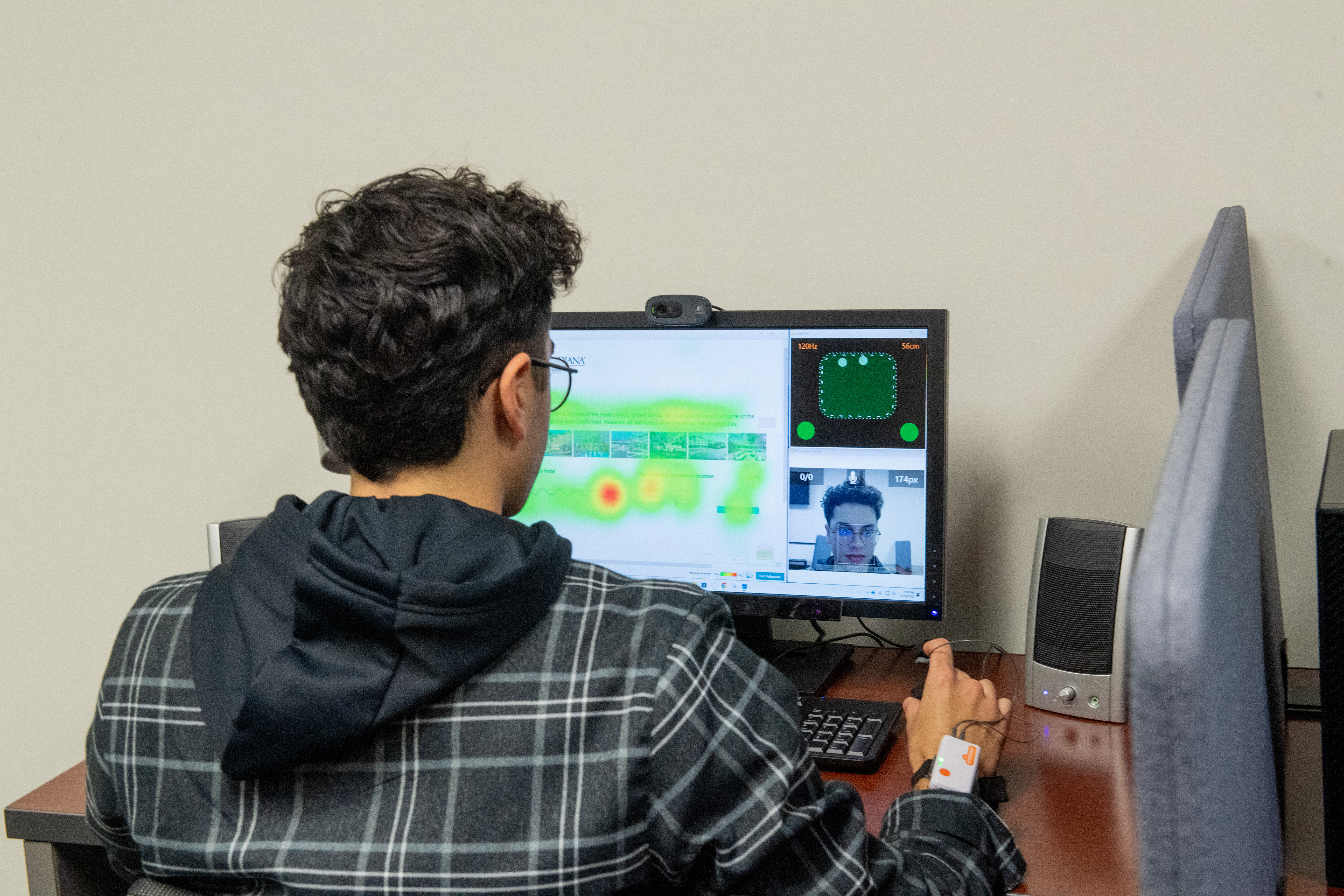 The Biometrix Discovery Lab utilizes biometric sensors to conduct research on decision making in the context of computer-based information presentation and tasks by measuring human attention, arousal, cognition and emotion. By tracking eye movement, skin reactions, heartbeat and facial expression, researchers can measure emotional responses to images or video and see how subjects interact with both digital media in a lab setting and their everyday surroundings with eye tracking glasses.