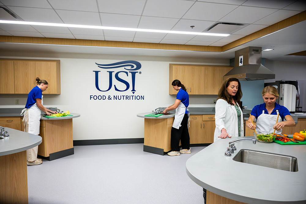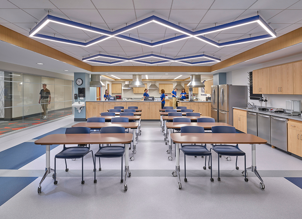 The Health Professions Center houses the Kinney College of Nursing and Health Professions and the Food and Nutrition Program. Food and Nutrition facilities include a variety of training areas.