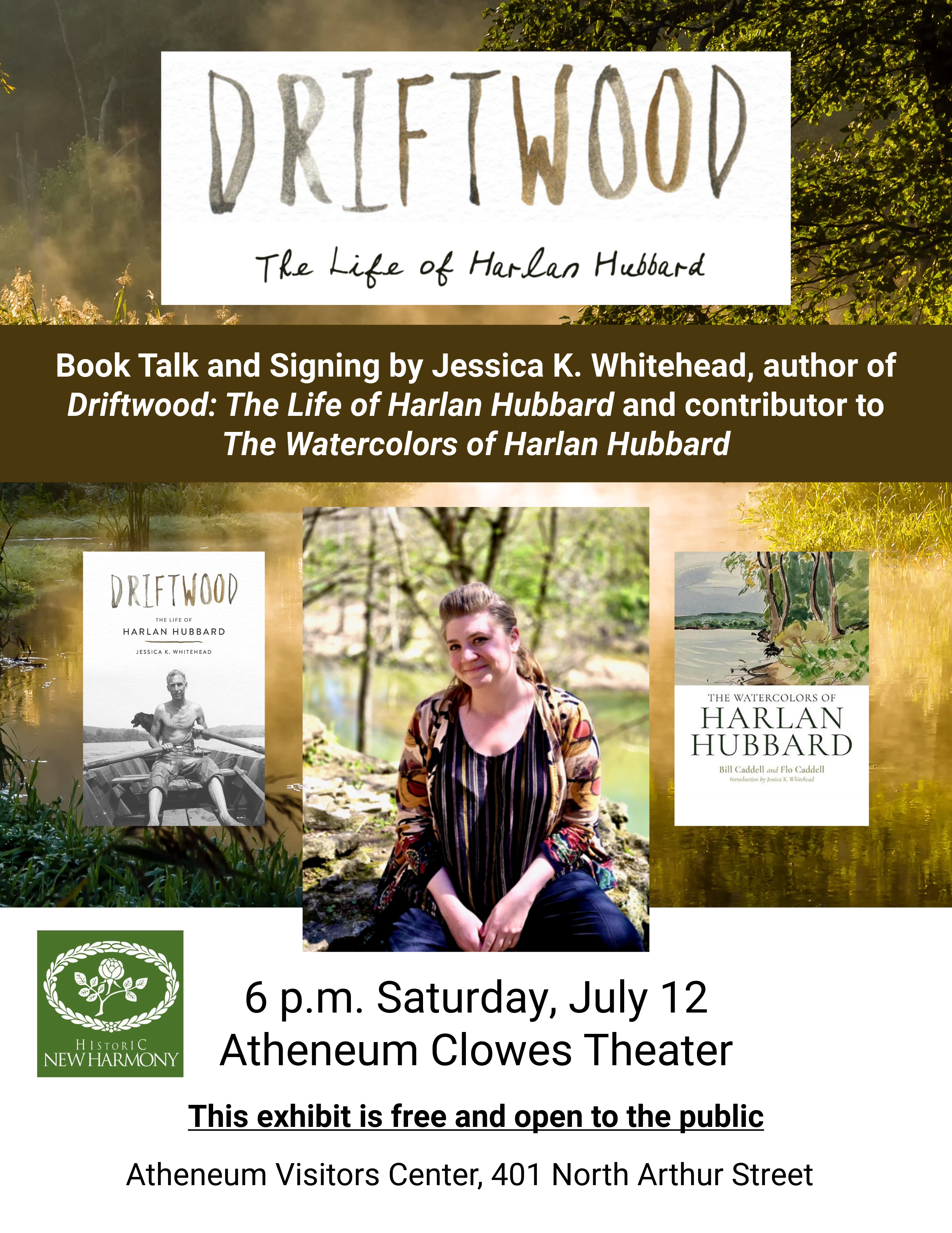 Join us at 6 p.m. on Saturday, July 12 at the Atheneum Visitors Center for an author talk, book signing and a meet & greet with public historian Jessica K. Whitehead. She will be discussing Harlan and Anna Hubbard’s lives and answering questions from the audience. Afterward, New Harmony musicians Donna and Wes Griffin will be performing acoustic music on the first floor of the Atheneum to accompany her book signing. Copies of the books Driftwood: The Life of Harlan Hubbard and The Watercolors of Harlan Hubbard are available for purchase in our Museum Shop.