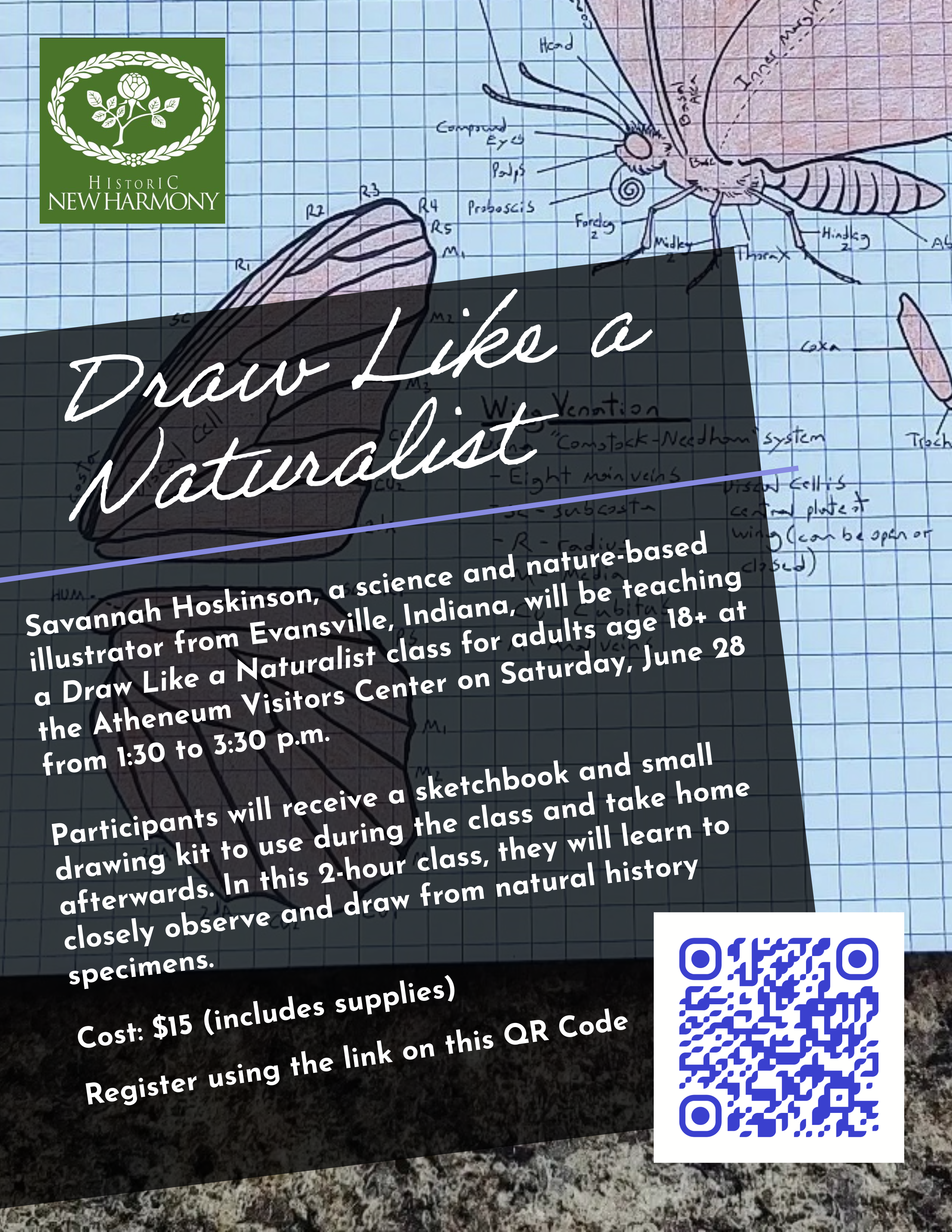 Savannah Hoskinson, a science and nature-based illustrator from Evansville, Indiana, will be teaching this Draw Like a Naturalist class for adults age 18+ at the Atheneum Visitors Center on Saturday, June 28 from 1:30 to 3:30 p.m. Participants will receive a sketchbook and small drawing kit to use during the class and take home afterwards. In this 2-hour class, they will learn to closely observe and draw from natural history specimens.