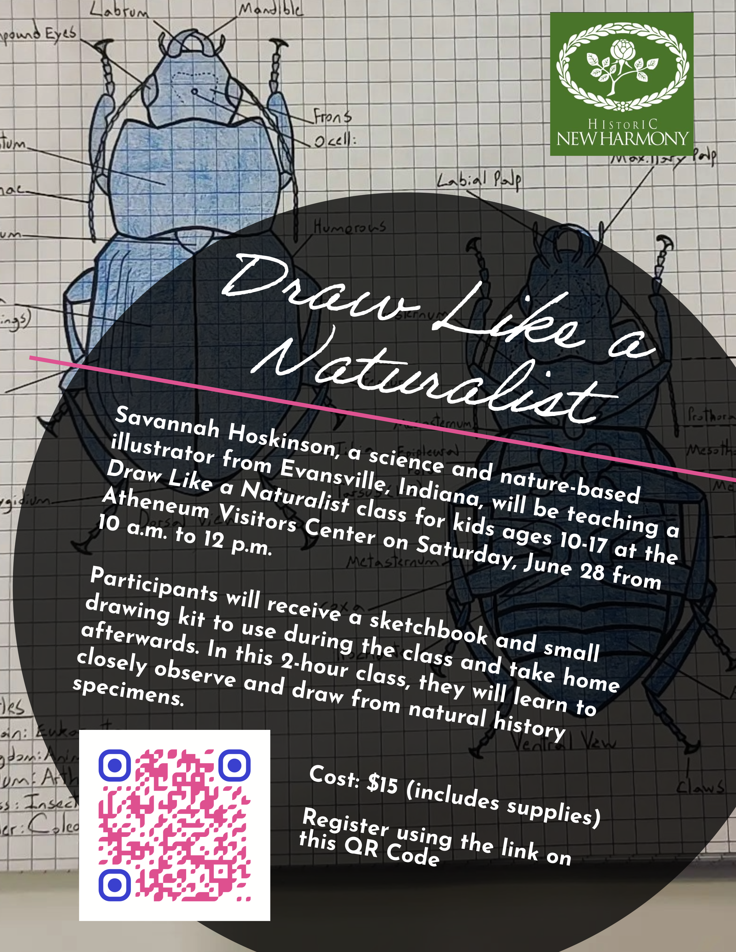 Savannah Hoskinson, a science and nature-based illustrator from Evansville, Indiana, will be teaching this Draw Like a Naturalist class for kids ages 10-17 at the Atheneum Visitors Center on Saturday, June 28 from 10 a.m. to 12 p.m. Participants will receive a sketchbook and small drawing kit to use during the class and take home afterwards. In this 2-hour class, they will learn to closely observe and draw from natural history specimens.