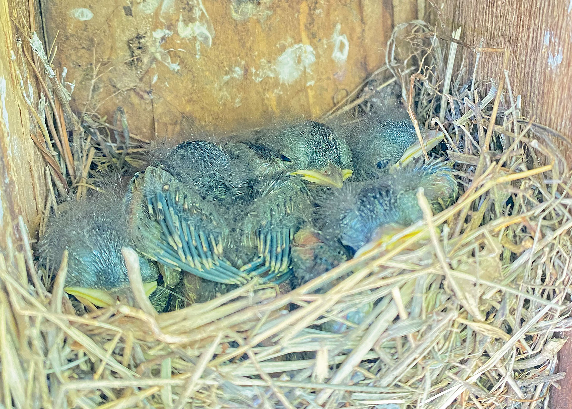 Members of the Westwood Garden Club and Audubon Society of Evansville met to put together 22 bluebird houses with donated wood. Virgil Eicher and Richard Buck put the houses up on the trail and everyone waited to see what would happen. The Club knew bluebirds can lay eggs up to three times a year, if the conditions are right.