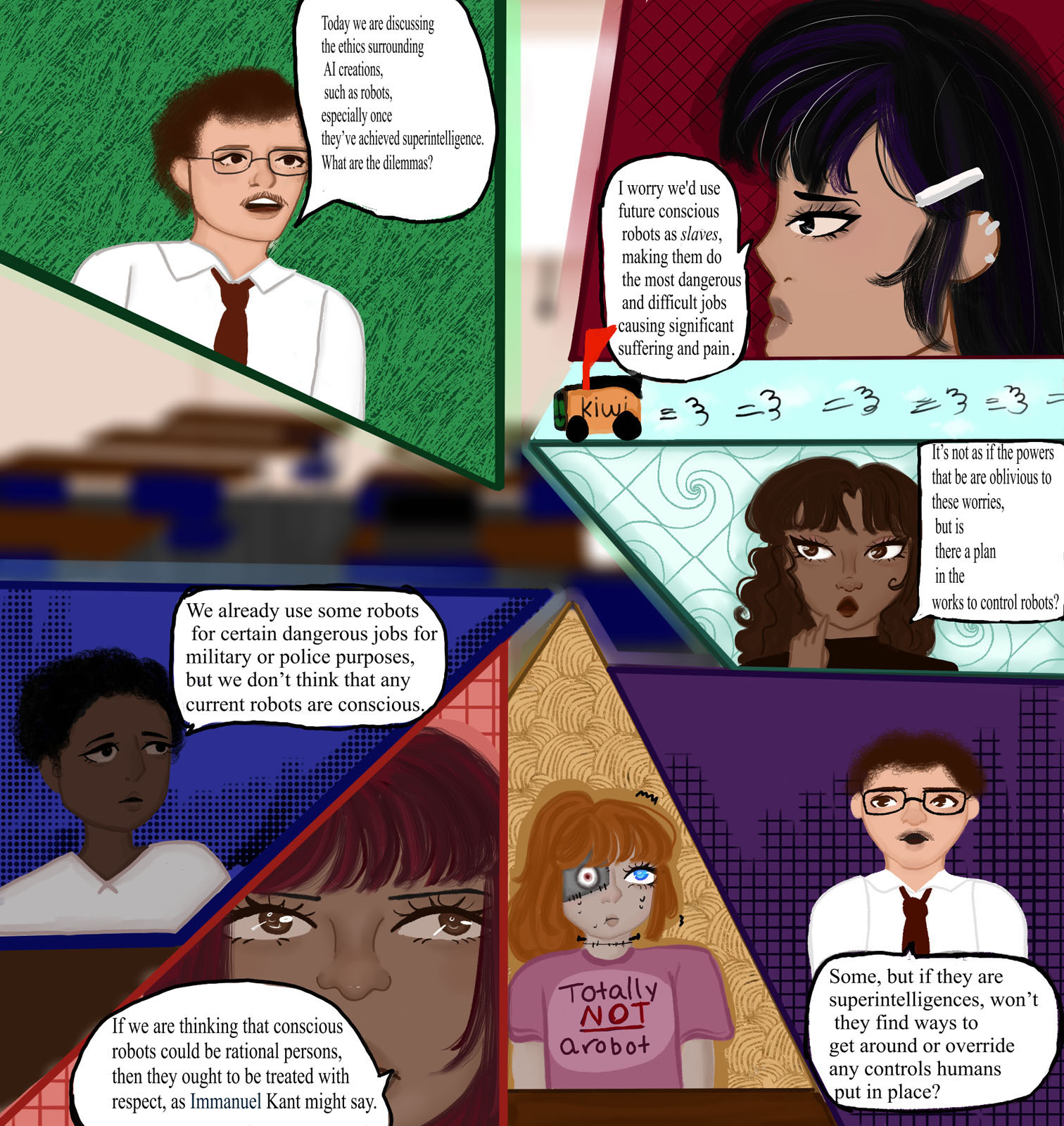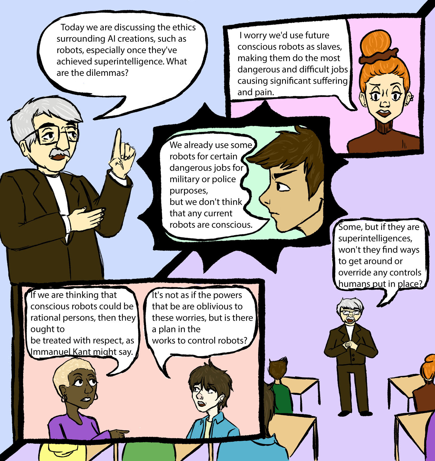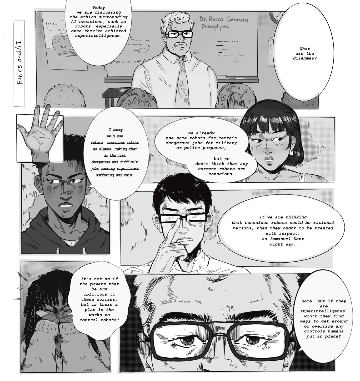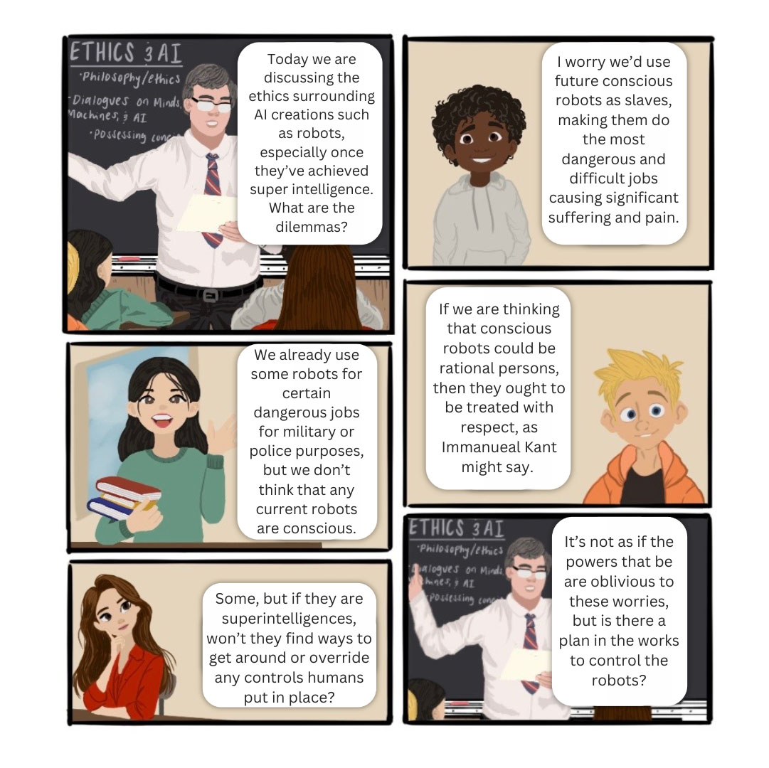 THIS GRAPHIC COMIC of students discussing artificial intelligence possessing consciousness was inspired by a book Dr. Rocco Gennaro, Professor of Philosophy, is working on, tentatively titled Dialogues on Minds, Machines, and AI (forthcoming, Routledge Press). Gennaro plans to teach a course on AI Ethics in Fall 2025.