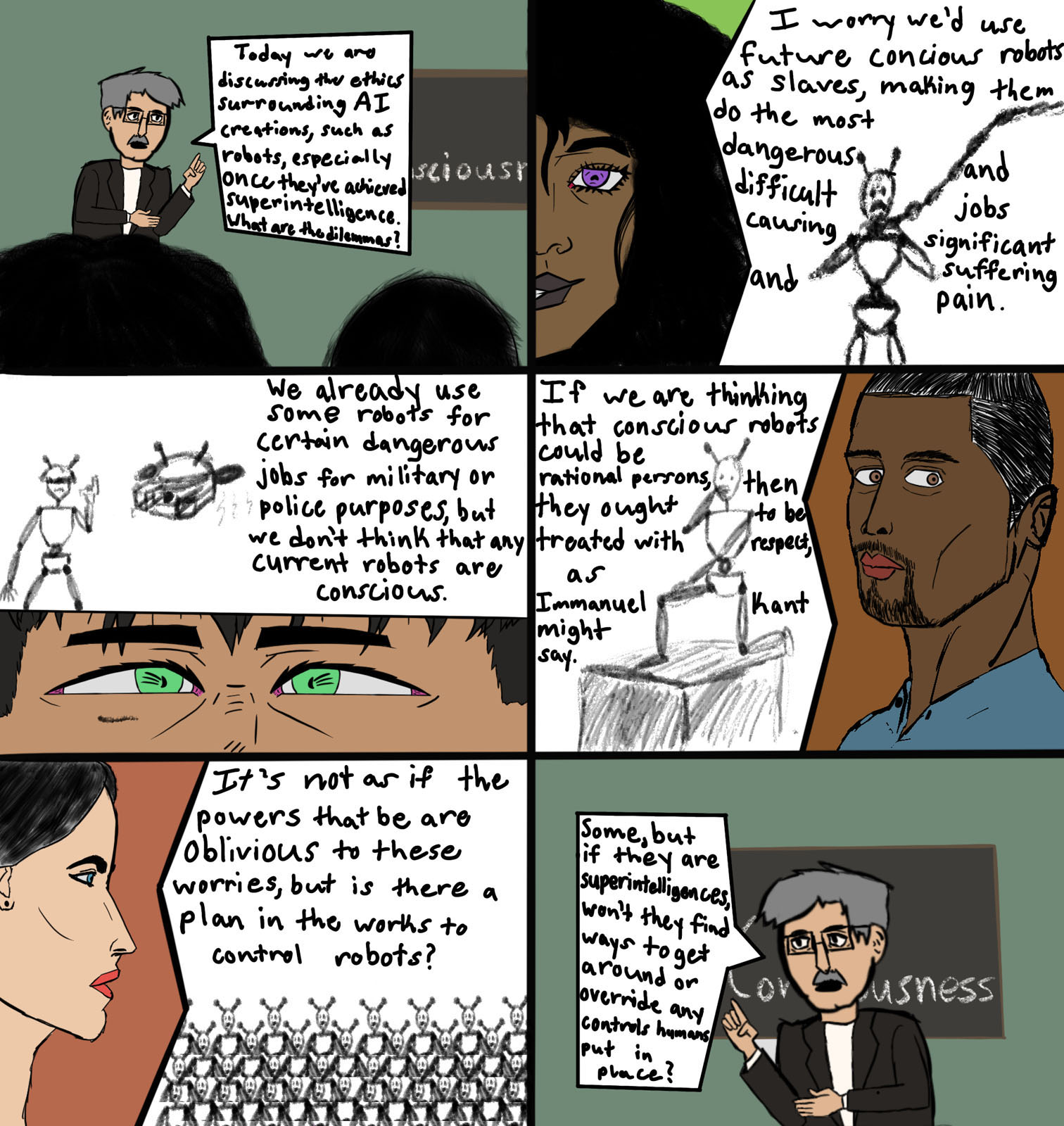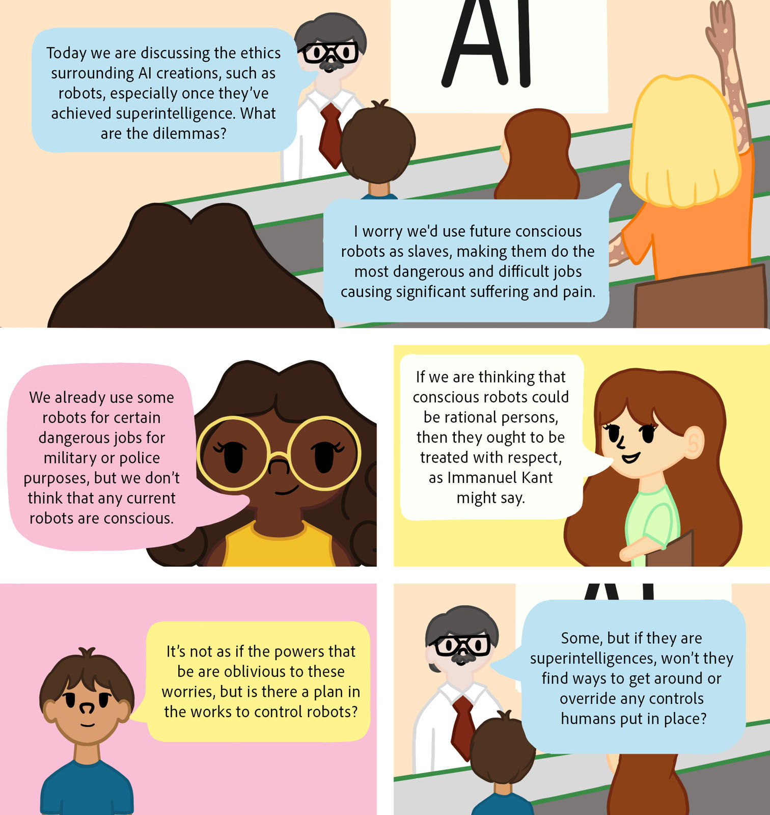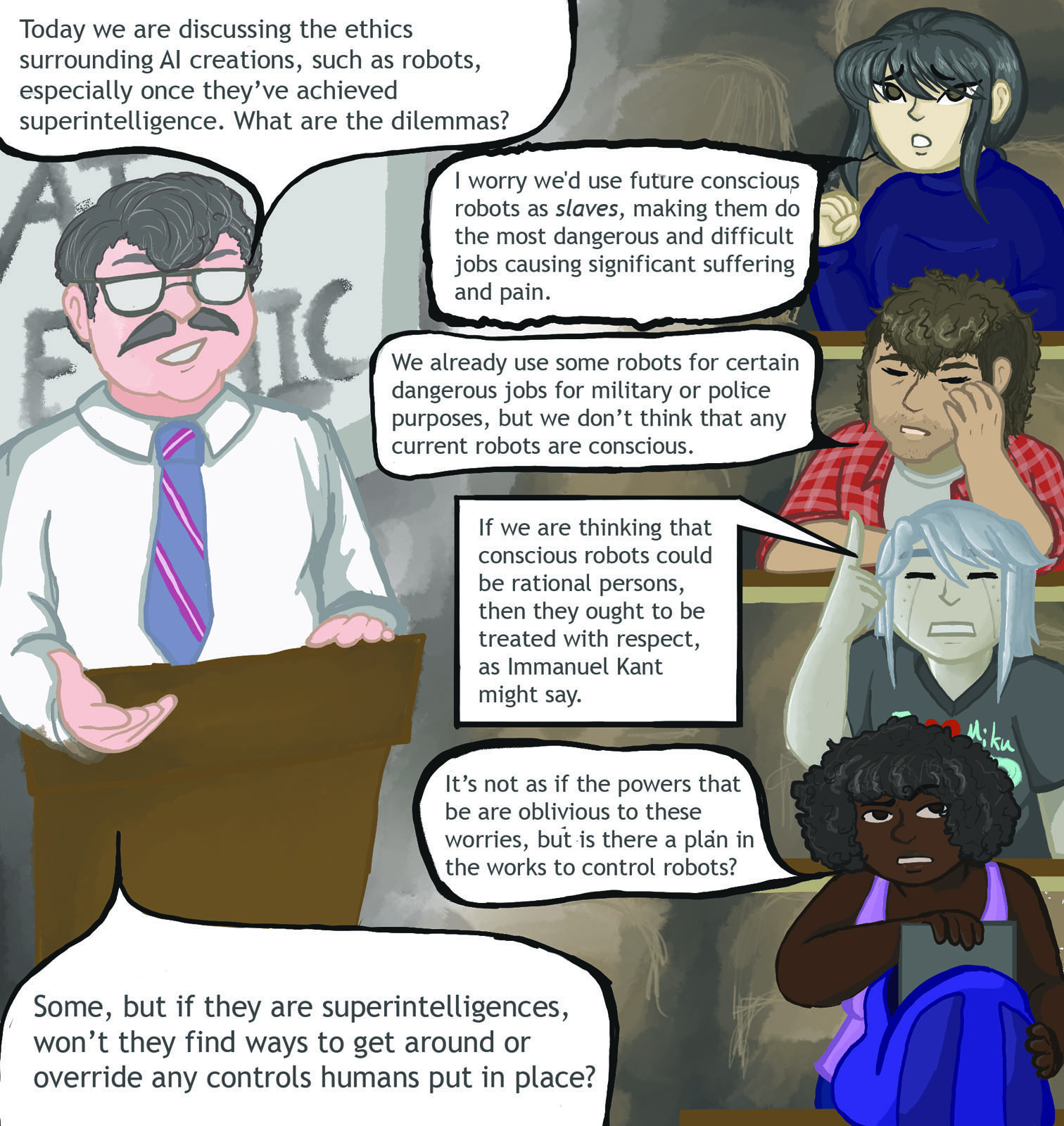THIS GRAPHIC COMIC of students discussing artificial intelligence possessing consciousness was inspired by a book Dr. Rocco Gennaro, Professor of Philosophy, is working on, tentatively titled Dialogues on Minds, Machines, and AI (forthcoming, Routledge Press). Gennaro plans to teach a course on AI Ethics in Fall 2025.