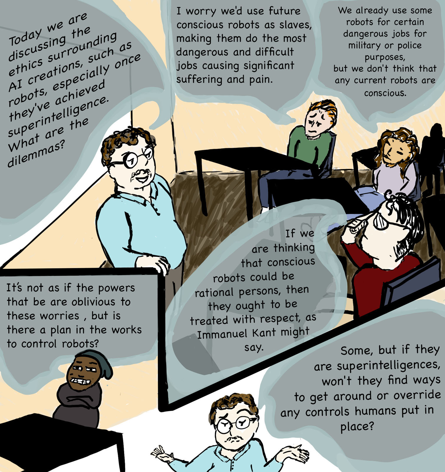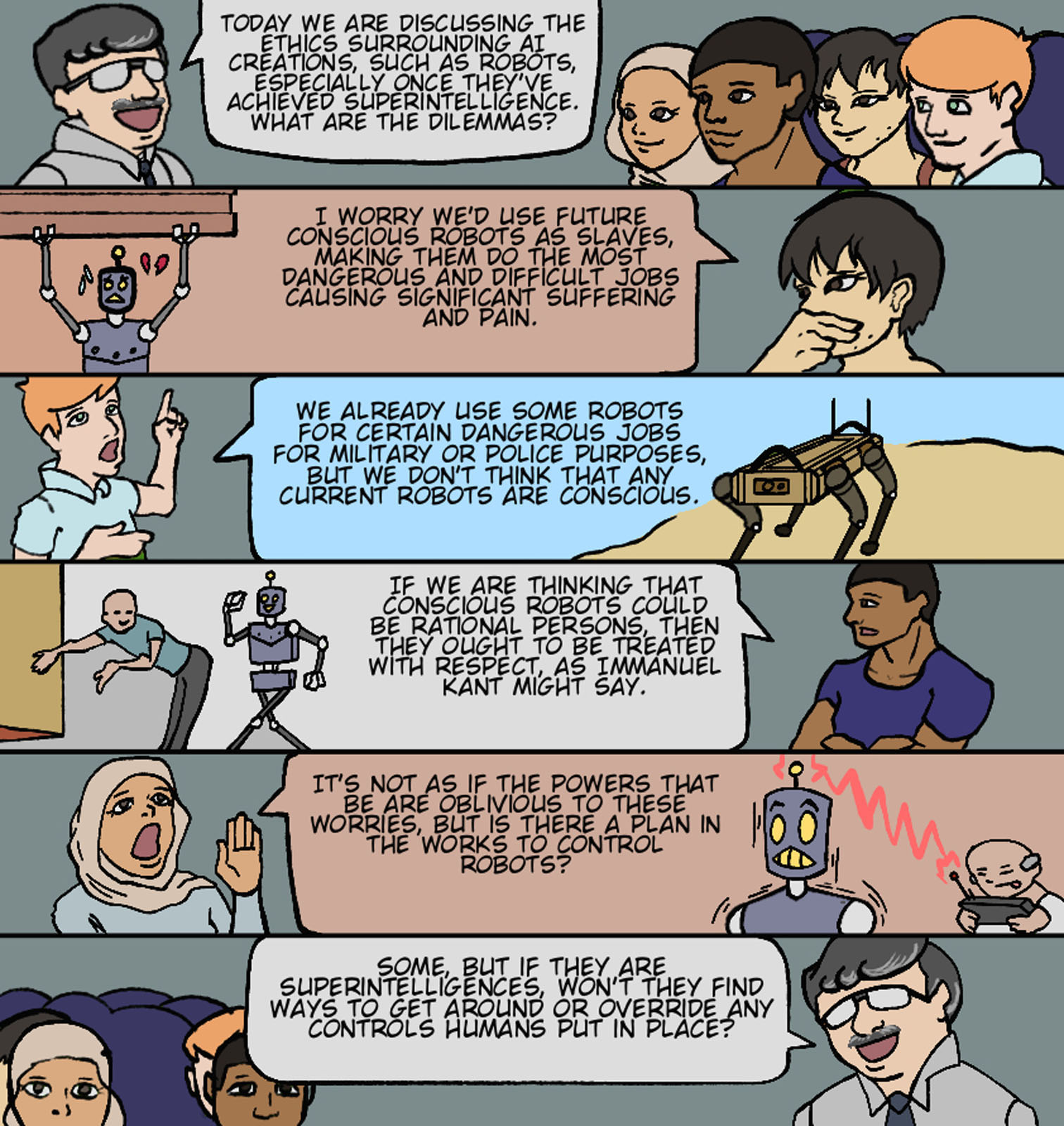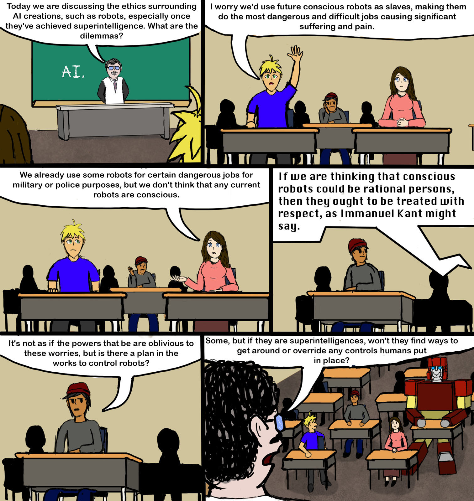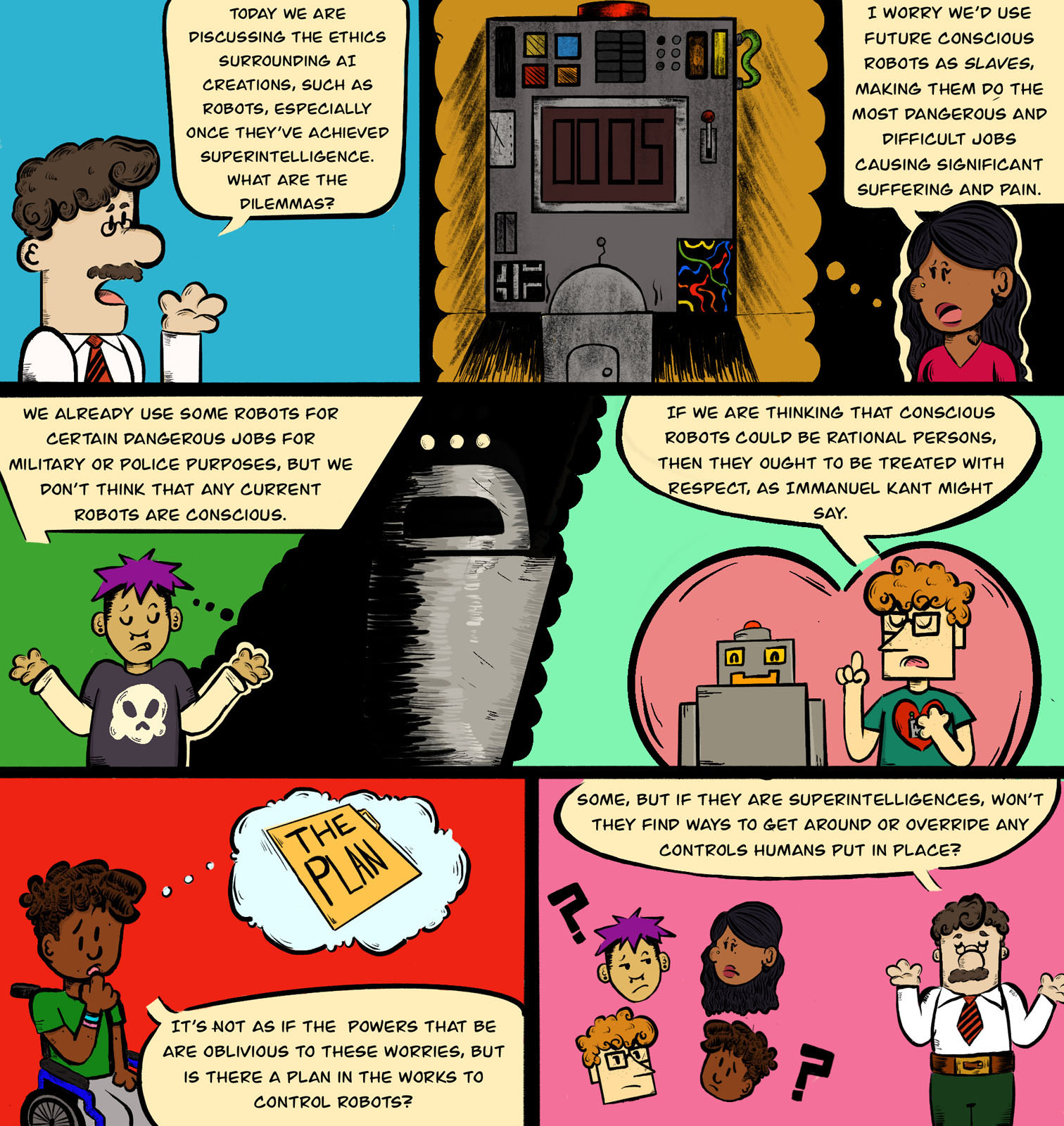 THIS GRAPHIC COMIC of students discussing artificial intelligence possessing consciousness was inspired by a book Dr. Rocco Gennaro, Professor of Philosophy, is working on, tentatively titled Dialogues on Minds, Machines, and AI (forthcoming, Routledge Press). Gennaro plans to teach a course on AI Ethics in Fall 2025.