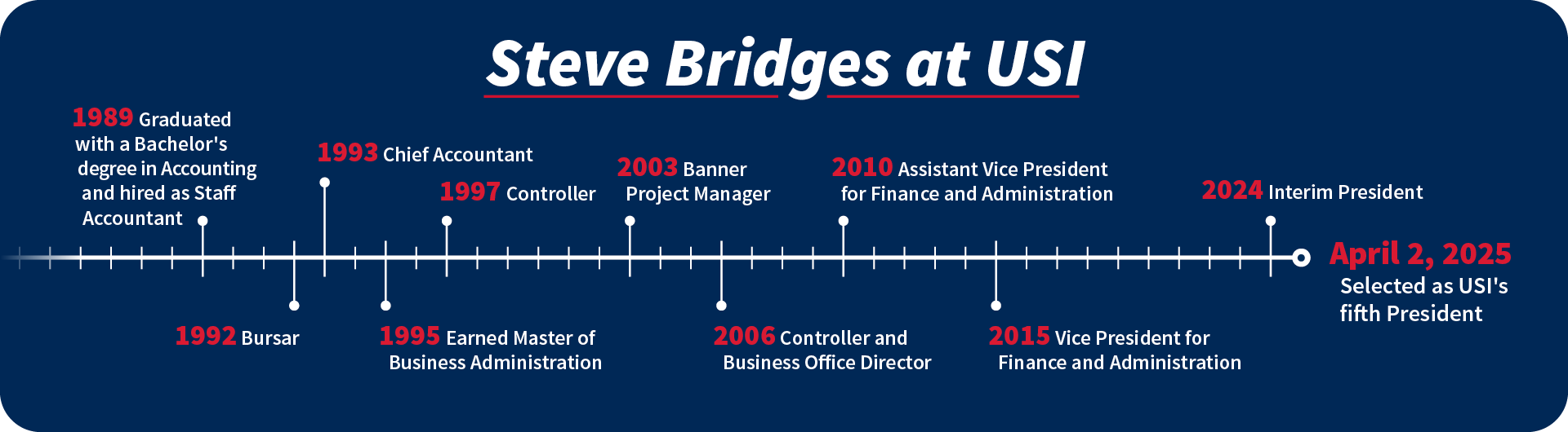 President Bridges began his journey at USI in 1989 as a Staff Accountant and steadily rose through the ranks, eventually overseeing the University's entire Finance and Administration operation. "The extraordinary education I received at USI has prepared me well and will continue to take center stage for our students," he said. "As a Screaming Eagle, and one of more than 54,000 alumni, I am determined to continue to share the care and concern I received as a student and am proof of the transformative nature of higher education." As Vice President for Finance and Administration, Bridges led the largest bond issuance in school history and secured a record-low rate for another. He implemented the campus-wide Banner system on time and on budget, chaired key committees to strengthen fiscal stewardship and helped USI avoid layoffs during the COVID-19 pandemic—a major accomplishment in higher education at that time.
