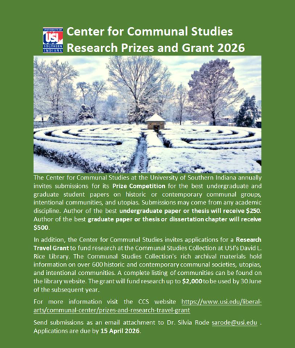 In addition, the Center for Communal Studies invites applications for a Research Travel Grant to fund research at the Communal Studies Collection at USI's David L. Rice Library. The Communal Studies Collection's rich archival materials hold information on over 600 historic and contemporary communal societies, utopias, and intentional communities. A complete listing of communities can be found on the library website. The grant will fund research up to $2,000 to be used by 30 June of the subsequent year. For more information visit the CCS website https://www.usi.edu/liberal-arts/communal-center/prizes-and-research-travel-grant Send submissions as an email attachment to Dr. Silvia Rode, sarode@usi.edu. Applications are due by April 15, 2026.
