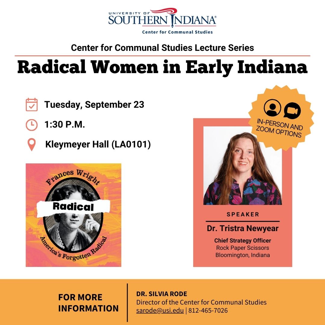 Indiana was home to some of America’s most radical progressive voices in the early 19th century–and some of them were women. Frances Wright, writer, speaker, and activist, came to New Harmony out of curiosity and left changed, beginning a career that won her praise and infamy in her day. Her work against slavery and for women’s broader role in society set the stage for a transformation of American society we are still experiencing today. In this lecture, we will explore her life and the other women who were like her, working toward an America more in line with our stated value of liberty and justice for all.