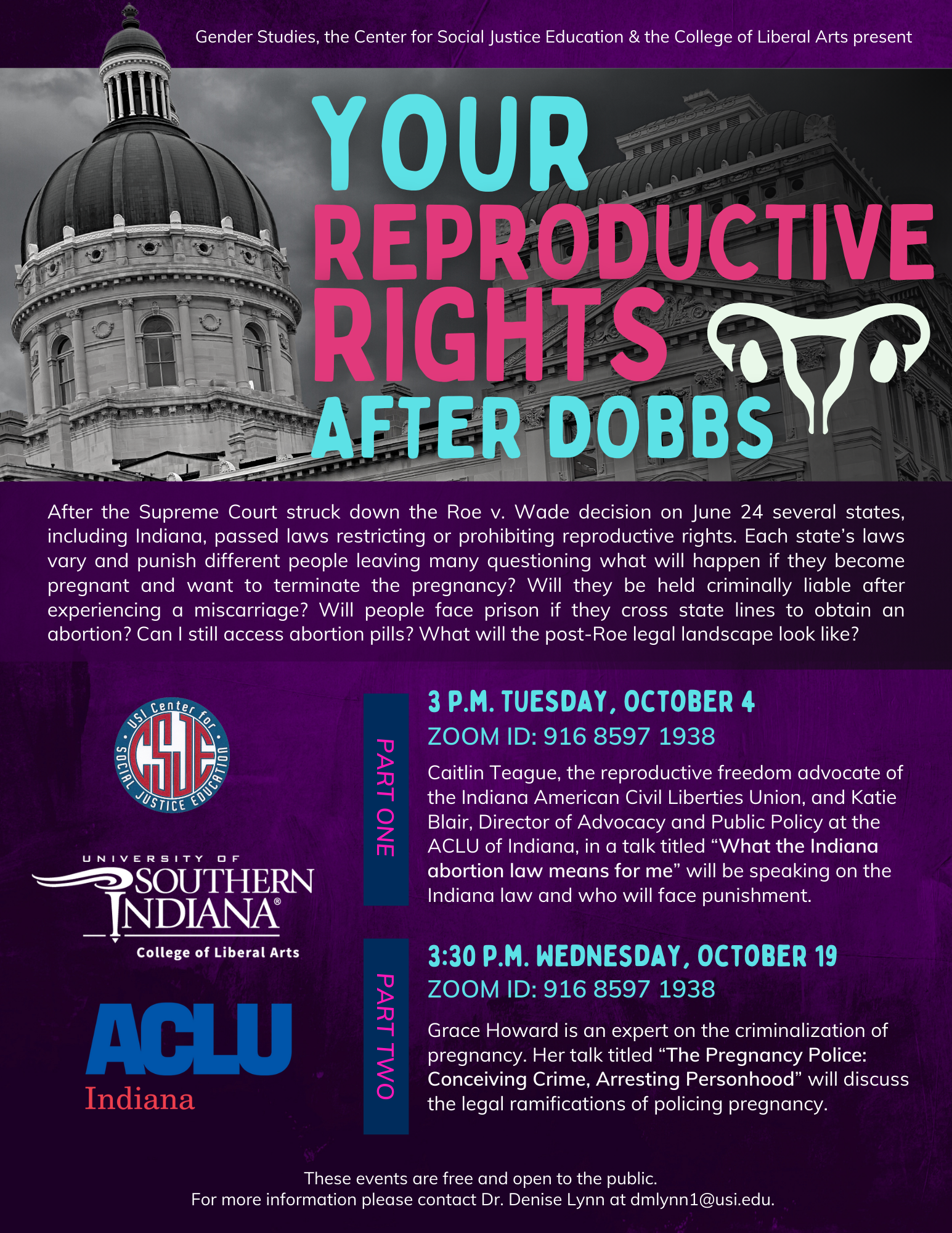 Join this Zoom webinar with former USI faculty member, Dr. Grace Howard. According to Howard, a wave of state legislation restricting the right to abortion has drawn attention to the contingency of rights of pregnant people. However, the regulation and criminalization of pregnant bodies in the United States began many years before. Drawing from original research in criminal cases, as well as from notable family court hearings, lawsuits and news reports, Howard explores some of the ways in which pregnant people have become subject to surveillance, regulation and control.