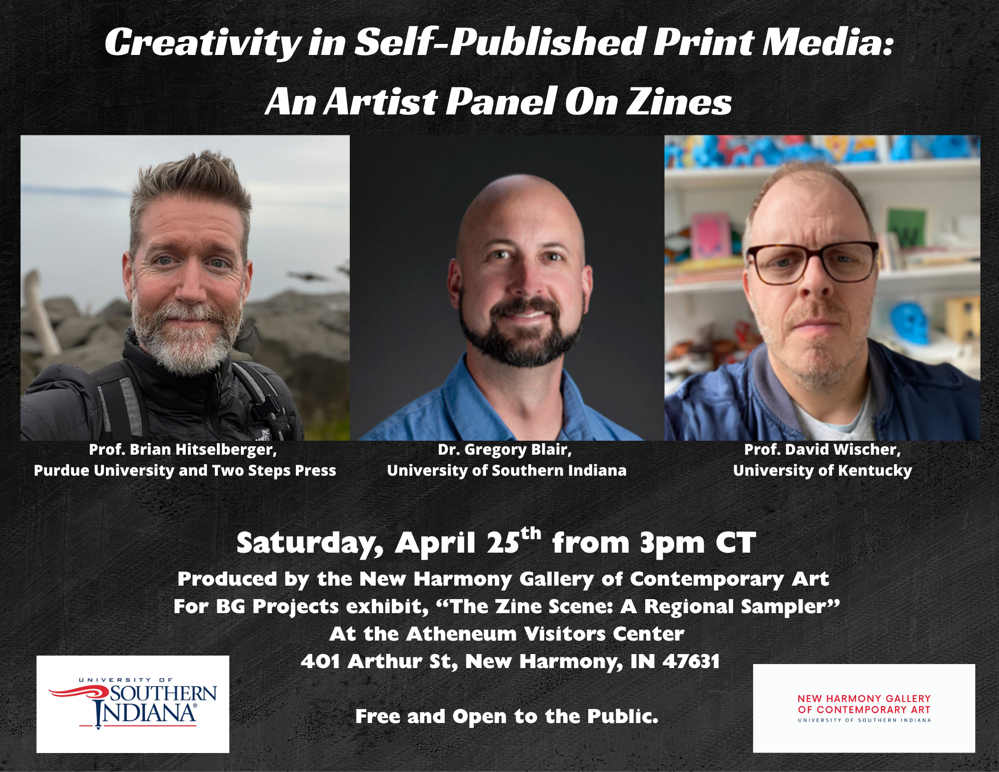 Accompanying BG Projects Exhibit "The Zine Scene: A Regional Sampler," this panel will feature discussion on the utility of zines as an accessible and popular format for artists. Featuring Purdue University Professor Brian Hitselberger, University of Southern Indiana Professor Greg Blair, and University of Kentucky Professor David Wischer in dialogue.