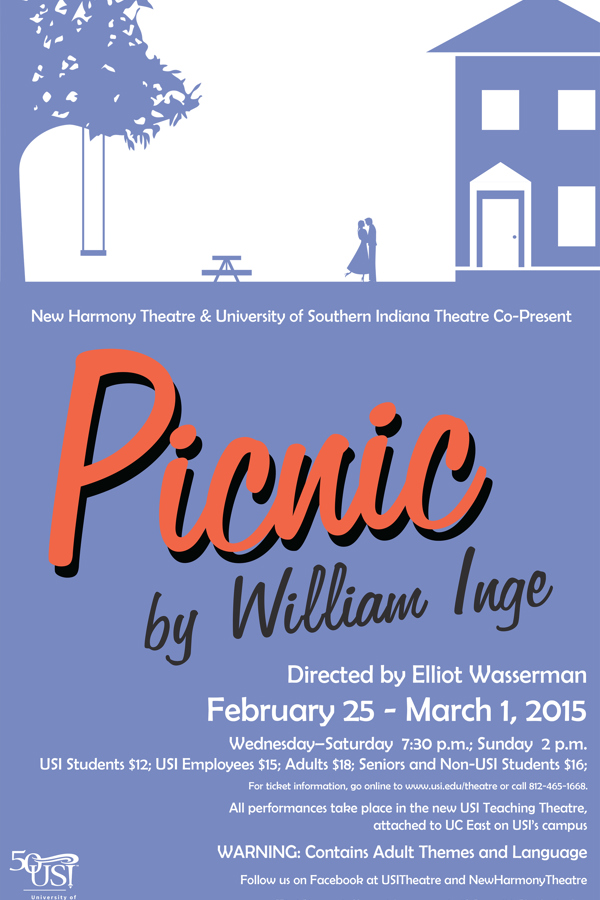 University of Southern Indiana Theatre will start the spring 2015 season with William Inge's Picnic. The production is part of the Repertory Project - a co-production of New Harmony Theatre and USI Theatre and will be showing February 25-March 1 in the new USI Performance Center.