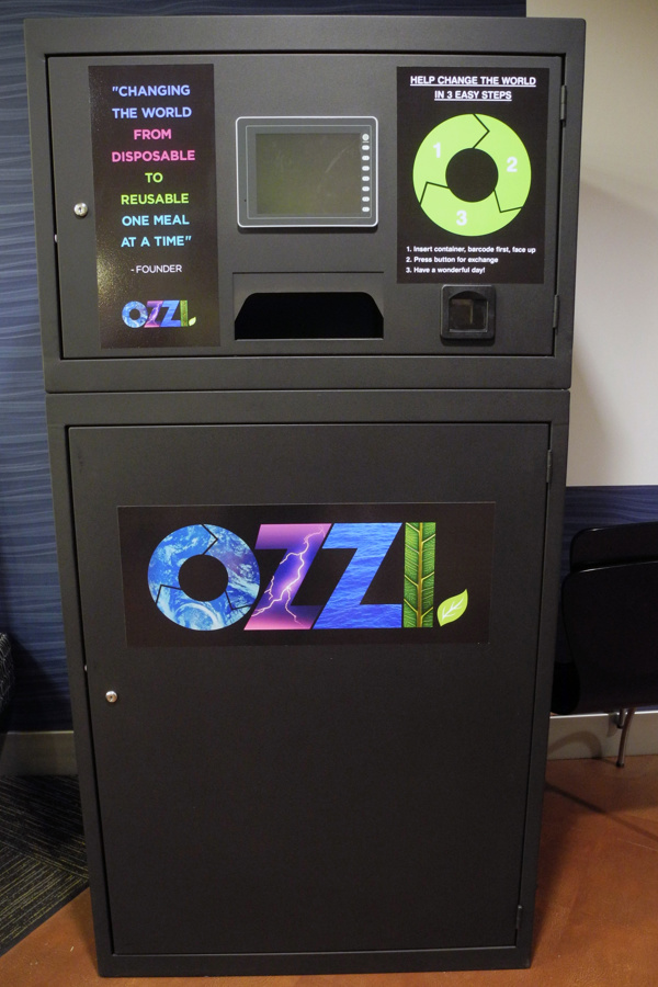 The reusable containers are collected at two OZZI System machines in the University Center, where they will be picked up, cleaned and sanitized, and can be reused up to 300 times. "We need to be good corporate citizens," said Robert Fruit, Sodexo executive chef, "and good corporate citizens take care of the environment in the communities where they operate."
