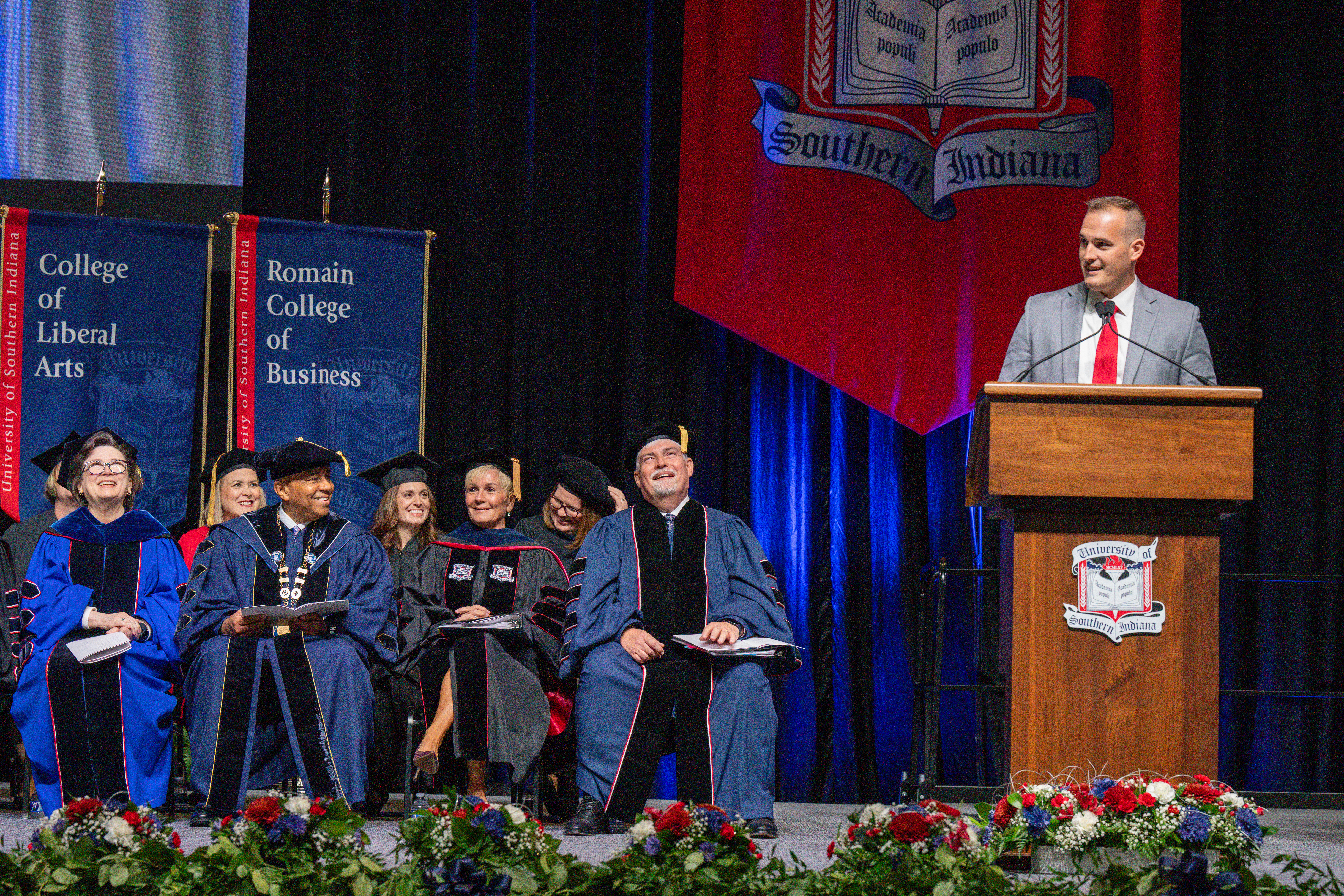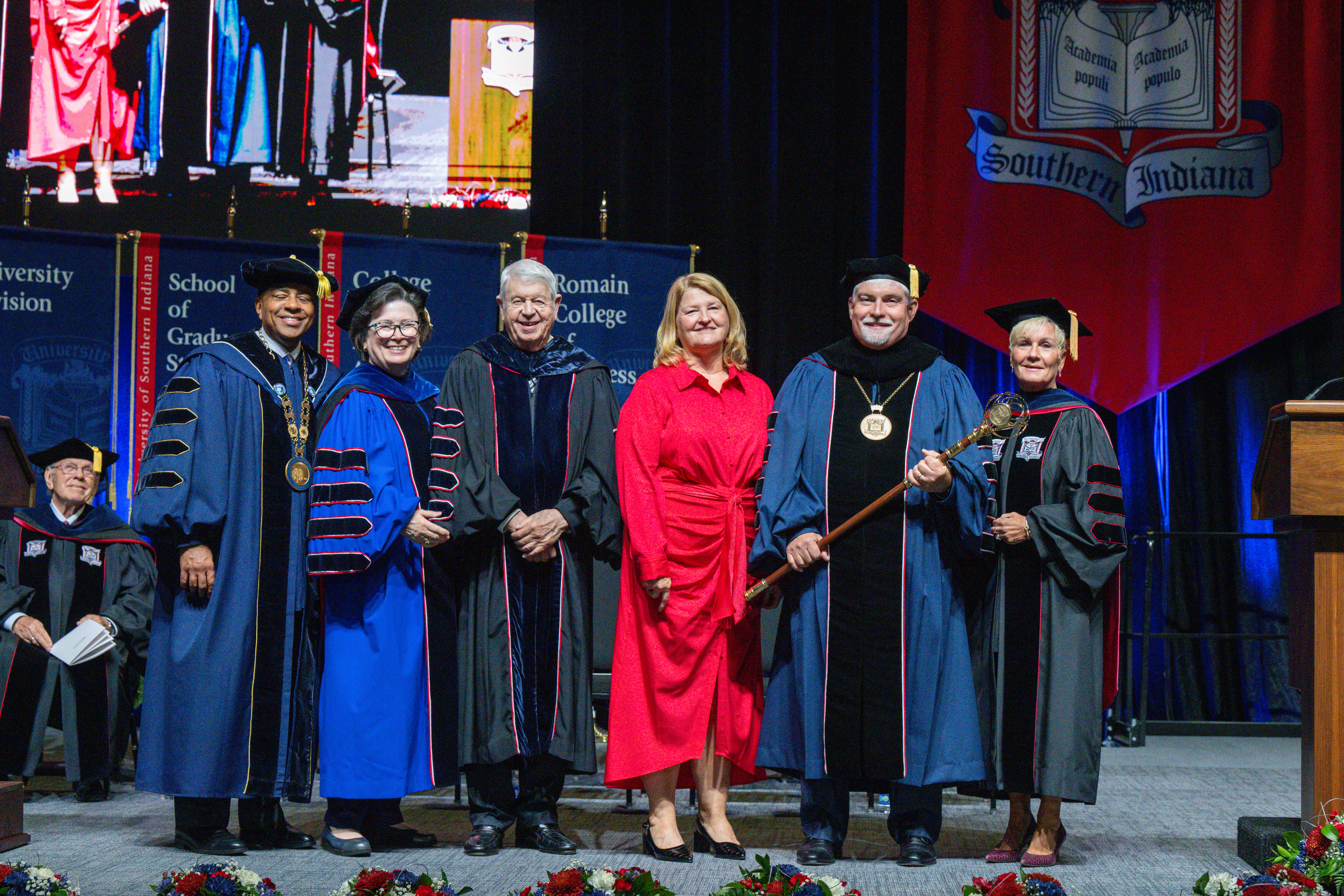 As part of the formal ceremony, presidents and delegates from colleges and universities across the country participated, along with USI students, faculty, alumni, members of the Board of Trustees, past USI Presidents, elected officials—including Evansville Mayor Stephanie Terry and a video salutation from Indiana Governor Mike Braun—and other special guests. Processional participants wore traditional academic regalia, many displaying the colors of the institutions they represented or graduated from. Choral music throughout the ceremony included pieces by the University of Southern Indiana Chamber Choir, Evansville Brass Quintet, Evansville Vanderburgh School Corporation Honors Choir and the Evansville Philharmonic.