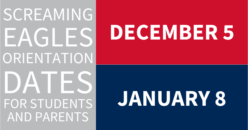 Students will be advised and registered for courses prior to their Screaming Eagles Orientation. You will schedule your advising appointment after you make your reservation for orientation. These advising appointments can be in person or by Zoom. There will be time in the afternoon of your orientation to meet with your advisor if no times available works.
