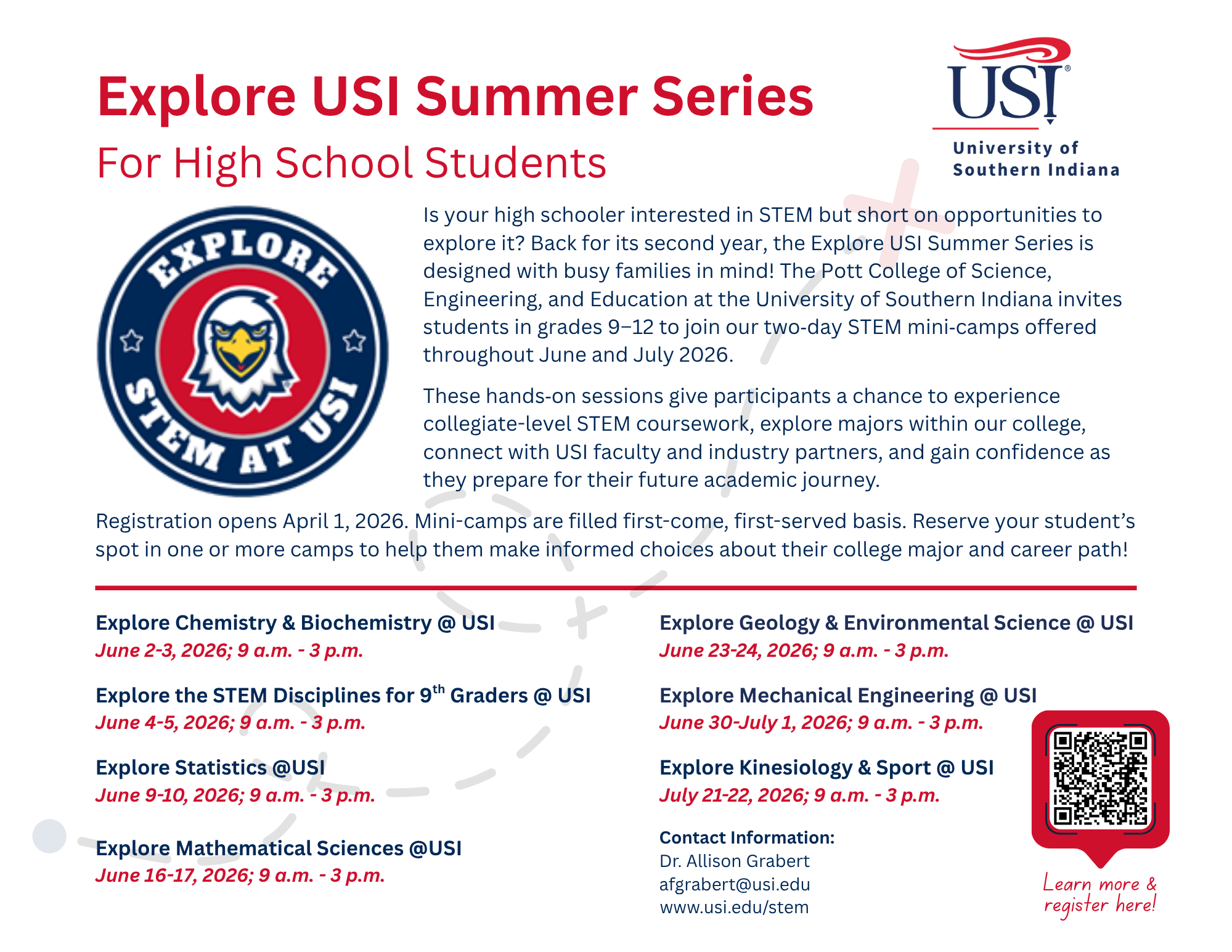 Is your high schooler interested in STEM but short on opportunities to explore it? Back for its second year, the Explore USI Summer Series is designed with busy families in mind! The Pott College of Science, Engineering, and Education at the University of Southern Indiana invites students in grades 9–12 to join our two‑day STEM mini‑camps offered throughout June and July 2026. These hands‑on sessions give participants a chance to experience collegiate-level STEM coursework, explore majors within our college, connect with USI faculty and industry partners, and gain confidence as they prepare for their future academic journey. Registration opens April 1, 2026. Space is limited and filled on a first‑come, first‑served basis upon payment. Secure your student’s spot in one or more camps to help them make informed decisions about their college and career path!