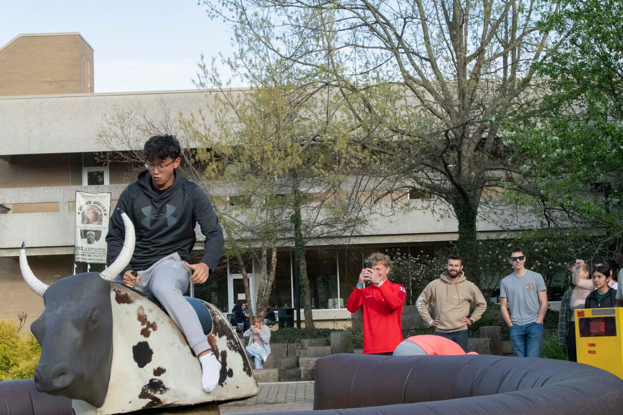 Students watch peers on the mechanical bull at SpringFest Field Day 2024