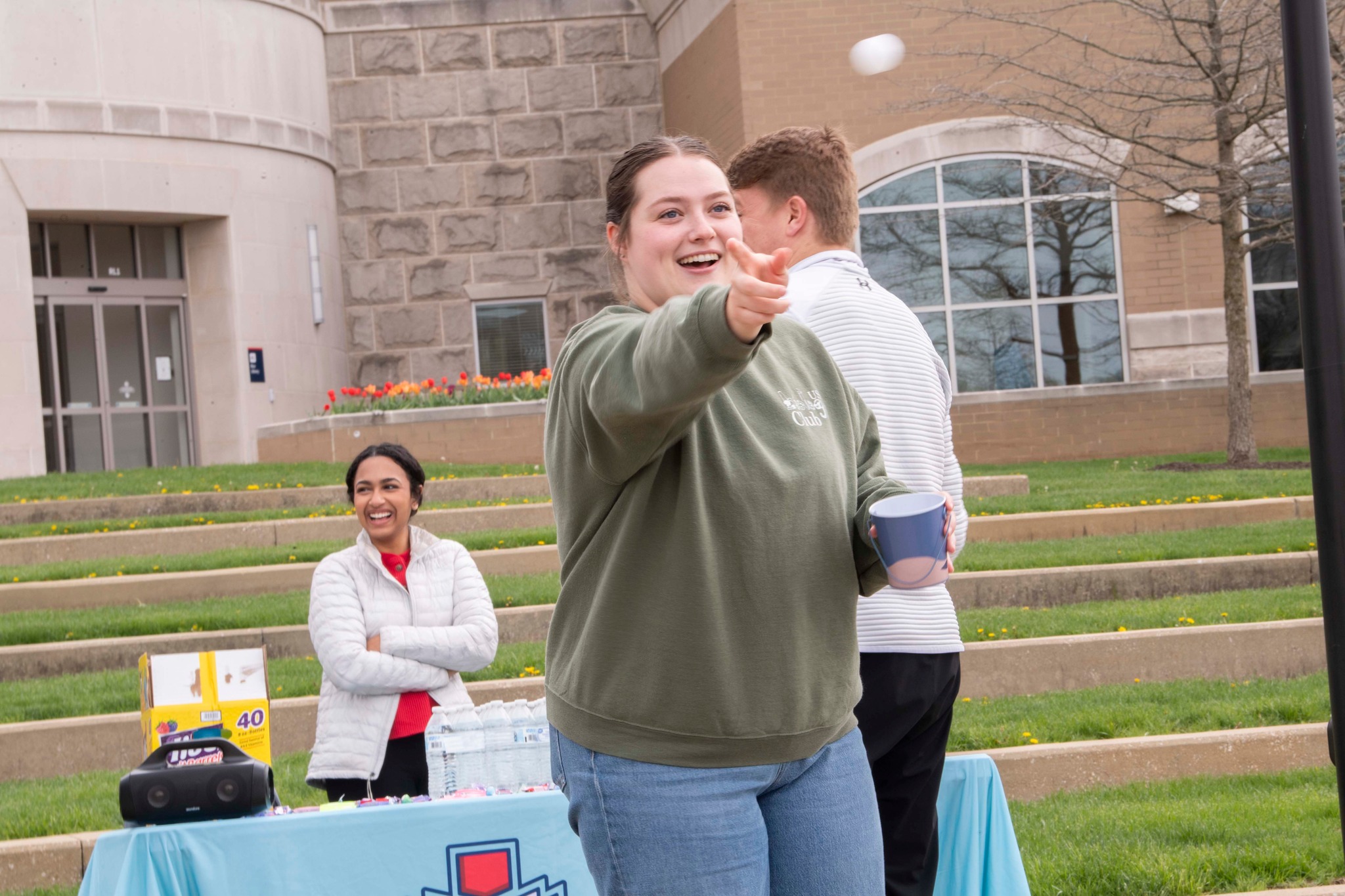 Students watch peers collect money in the Cash Cube at SpringFest Field Day 2024