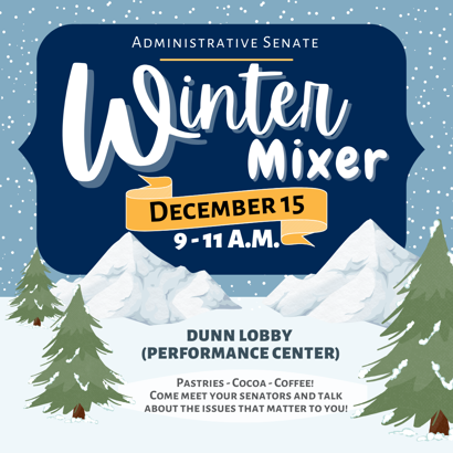 USI Administrative Senate will host a Winter Mixer from 9 to 11 a.m. Monday, December 15 in the Dunn Lobby of the Performance Center. Pastries, cocoa and coffee will be available. Administrators are invited to come and meet with senators to connect and have discussions.