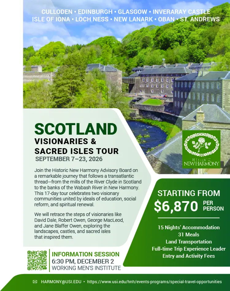 As a National Historic Landmark on the banks of the Wabash River, New Harmony preserves the sites where three distinct communities—the Harmonists, the Owenites, and the generations that followed—shaped one of America's most remarkable towns. As a University of Southern Indiana program, we care for collections that document this extraordinary history from 1814 to the present, develop educational programs and public events, engage with the local community, and make these resources accessible to researchers and visitors from around the world.