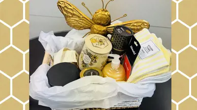 Value $190. Set of 3 Kitchen Towels, Jar of Wildflower Honey, Honey Spoons, Honey Lemon Tea, Honey Body Scrub, Beeswax Candle, Honey Hand Soap, Honey Bee Wall Decor, and $100 Schnucks Gift Card. Donated by the Provost's Office.