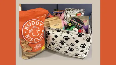 Value $185. Dog basket filled with dog toys, a blanket and dog treats. Donated by Vicki Brasel @ State Farm.