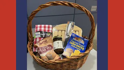 Value $45. Taking you back to the AA&A beginning with apple butter, a bread knife, and cutting board, kitchen towel and two (2) bread mixes that would be delicious with some apple butter.