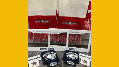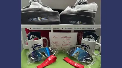 Value $50. Archies' Army swag: scarves, mugs, magnets, license plate frames, and koozies. Donated by USI's Athletic Department.