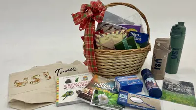 Value $ . Basket donated by the USI Trails Coalition. Portable hot/cold drink containers, canvas bag, informational guides on plants, animals and the history of the coalition, hand-held magnifier, personal guide through USI trails