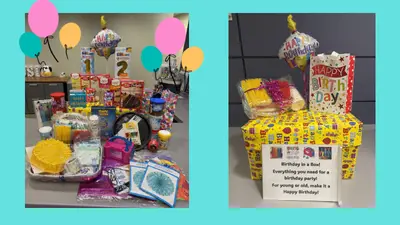 Value $150. Everything you need to throw a birthday party in one (1) box! Six (6) cake mixes, six (6) icing flavors, two (2) sprinkle variations, cake pans, Lilo & Stitch party decorations - balloons, table cloths, party sticks, gift bags and stickers, Kool-Aid mixes, candles and party sticks. Donated by the Social Work Department.