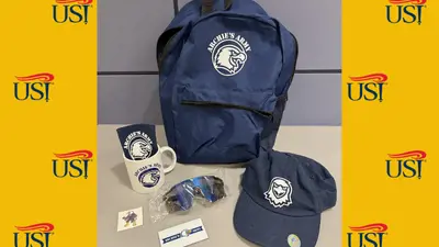 Value $55. Archie's Army swag: Backpack, Ball cap, mug, sunglasses, magnet, and key chain. Donated by USI's Athletic Department.