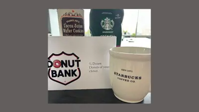 Value $25. Enjoy this coffee break with French Roast Starbucks coffee in a Starbucks mug alongside Trader Joe's Wafer Cookies AND 1/2 dozen donuts from the Donut Bank.
