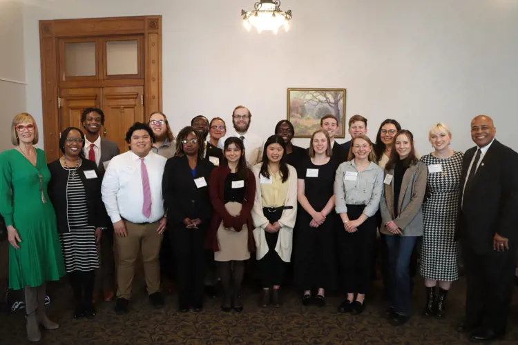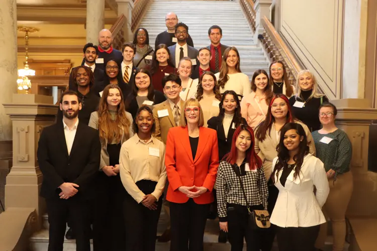 University of Southern Indiana visited the Indiana Statehouse on Tuesday, April 4, 2023. The daylong event kicked off with several legislators and USI alumni working in government affairs joining and speaking with the students over lunch. Students, alumni and staff were privileged to be invited into Lt. Governor Suzanne Crouch's office for a meet and greet session and photo. Students were also guided through a tour and allowed time to explore and observe the House and Senate Legislative Sessions in action. | April 4, 2023