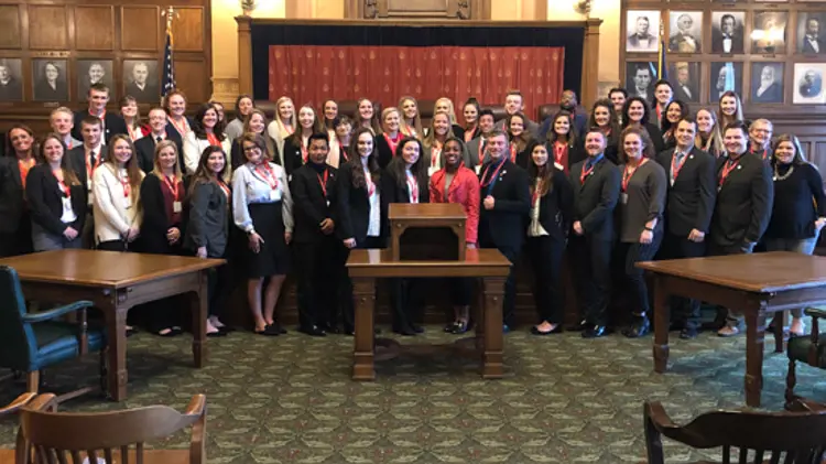 University of Southern Indiana Women's Softball team was recognized by the State Legislature for their 2018 NCAA Division II National Championship. Students were given a tour of the Statehouse and paused for a group picture in the room that houses Indiana's Supreme Court. | February 12, 2019