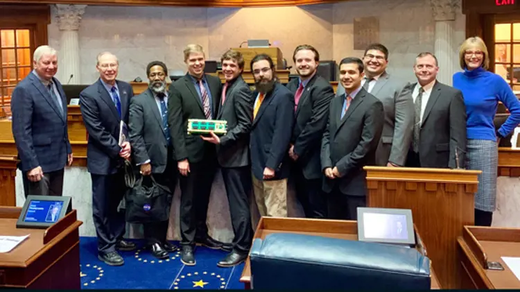University of Southern Indiana Engineering students and Associate Professor Glen Kissel were honored by a joint resolution of the Indiana Legislature for the successful launch on December 5, 2018 of the UNITE CubeSat aboard a SpaceX Dragon cargo ship bound for the International Space Station. | March 5, 2019