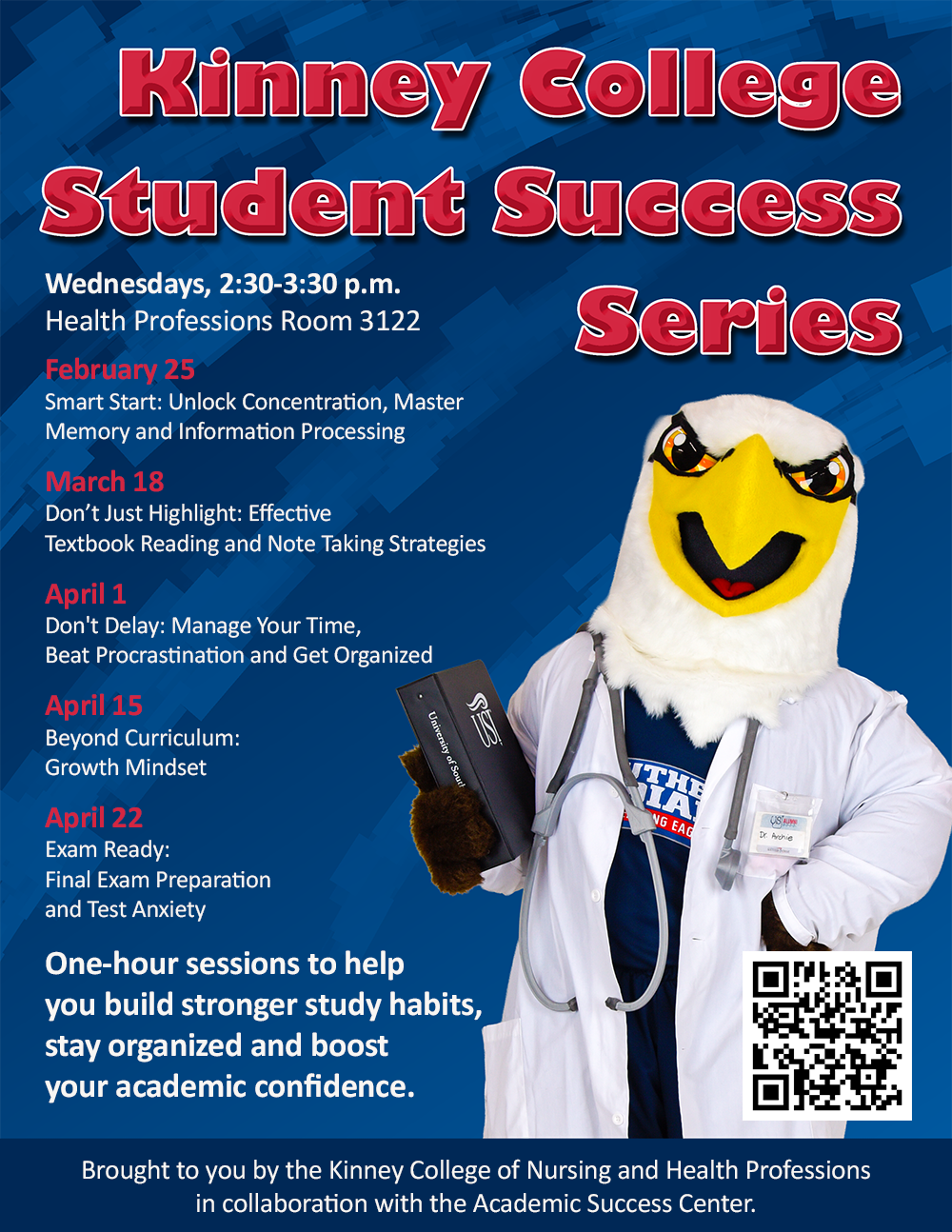 Join us this spring for the Kinney College Student Success Series, hosted in partnership with the USI Academic Success Center. We’ve designed this lineup of sessions around what you told us you want—real strategies that make academic life easier, more manageable and more meaningful.