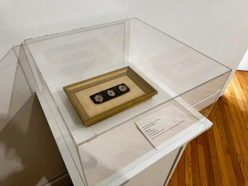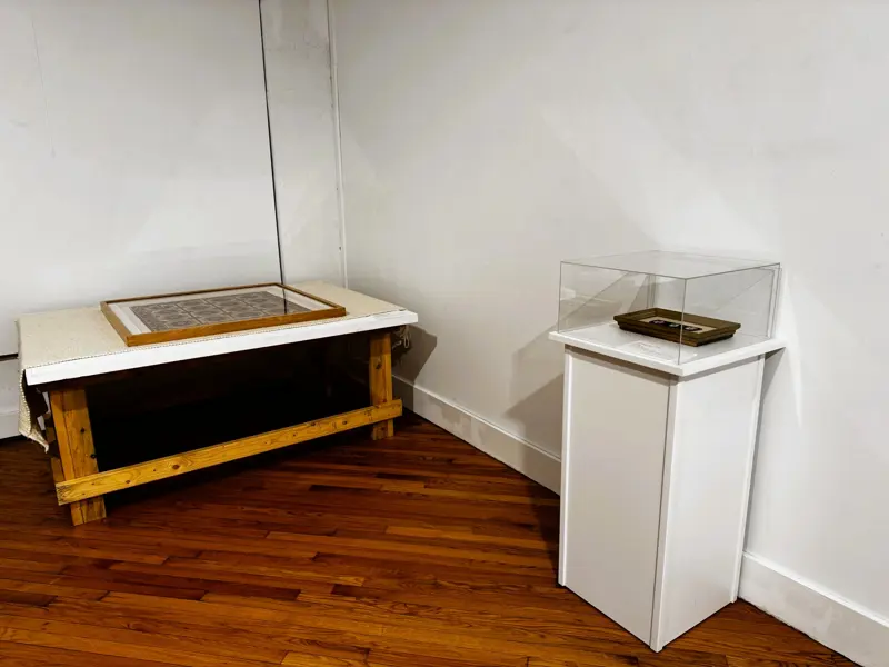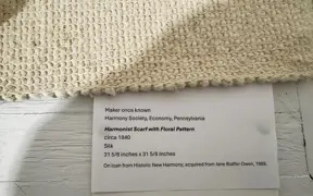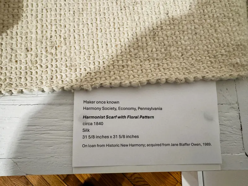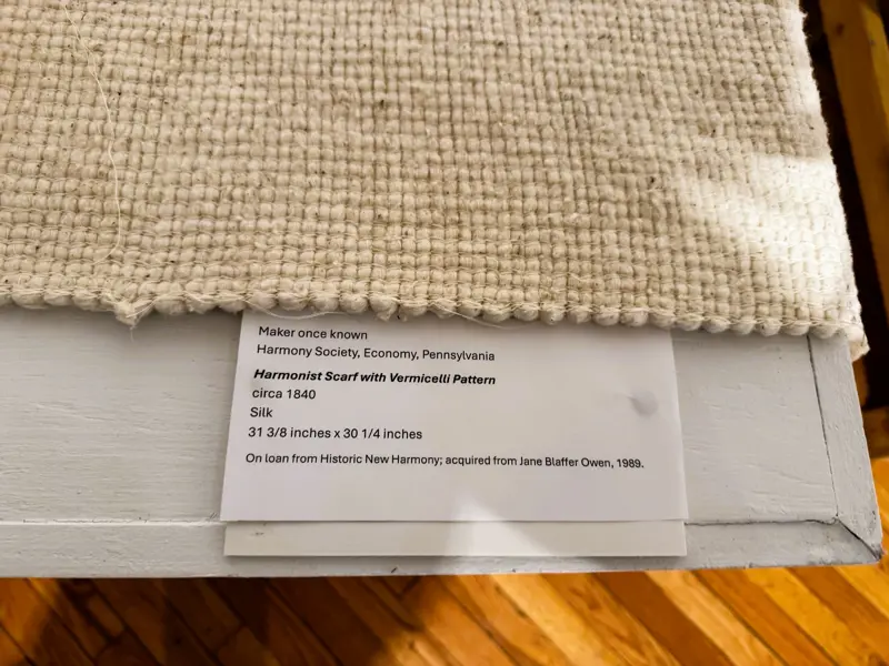 Historic New Harmony loaned four objects to Sarah G. Sharp's solo exhibition, And the thorns were cleared from the path..., on view from Saturday, January 10 to Saturday, February 21, 2026 at the New Harmony Gallery of Contemporary Art. In doing research for the exhibition, Sarah spent time exploring Historic New Harmony's collections with Collections & Community Engagement Manager Heidi Taylor-Caudill in March 2025. These four objects speak to themes in her work and the history of women's lives and labor in New Harmony.