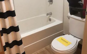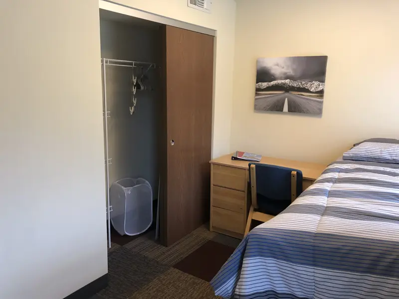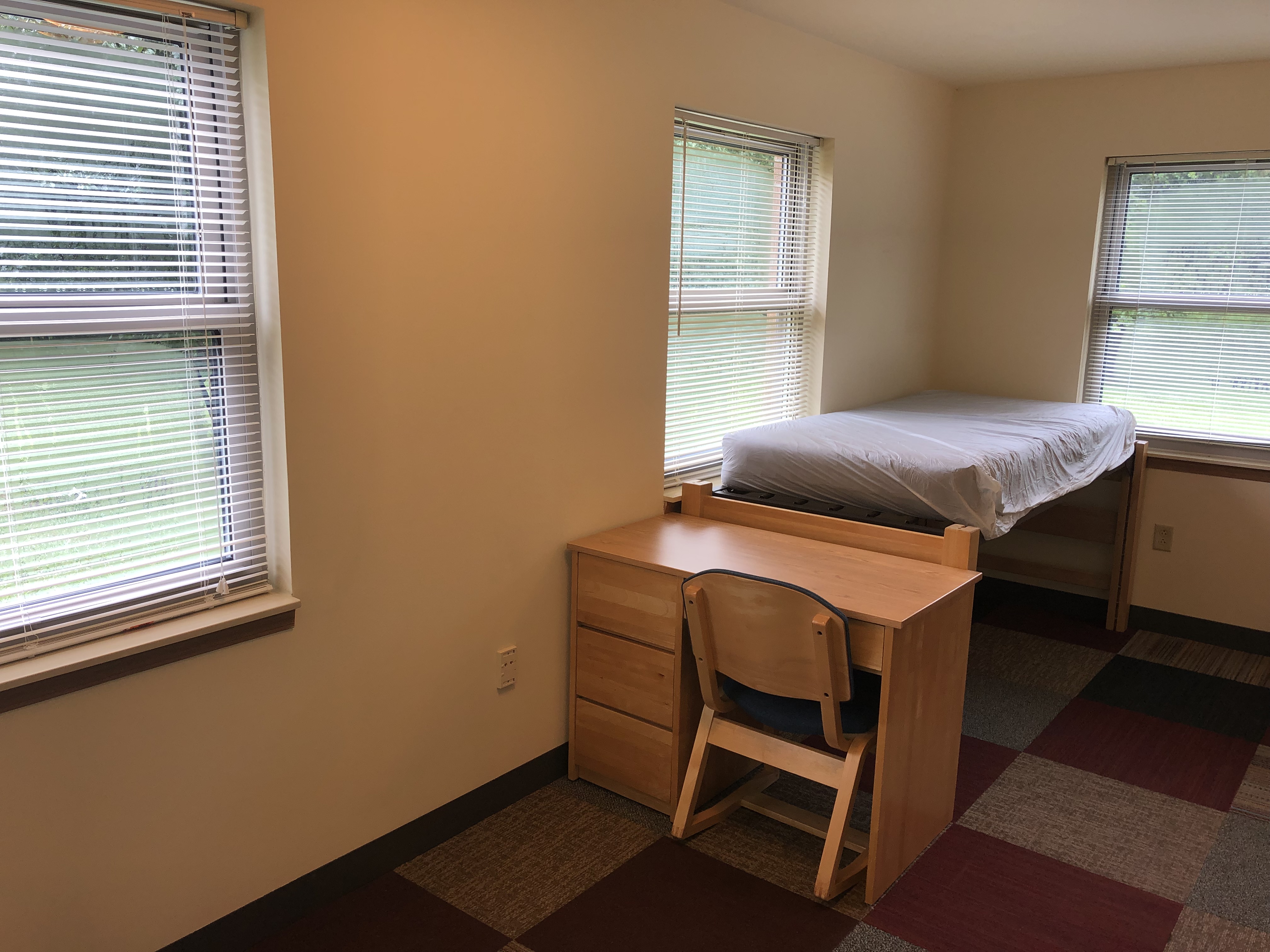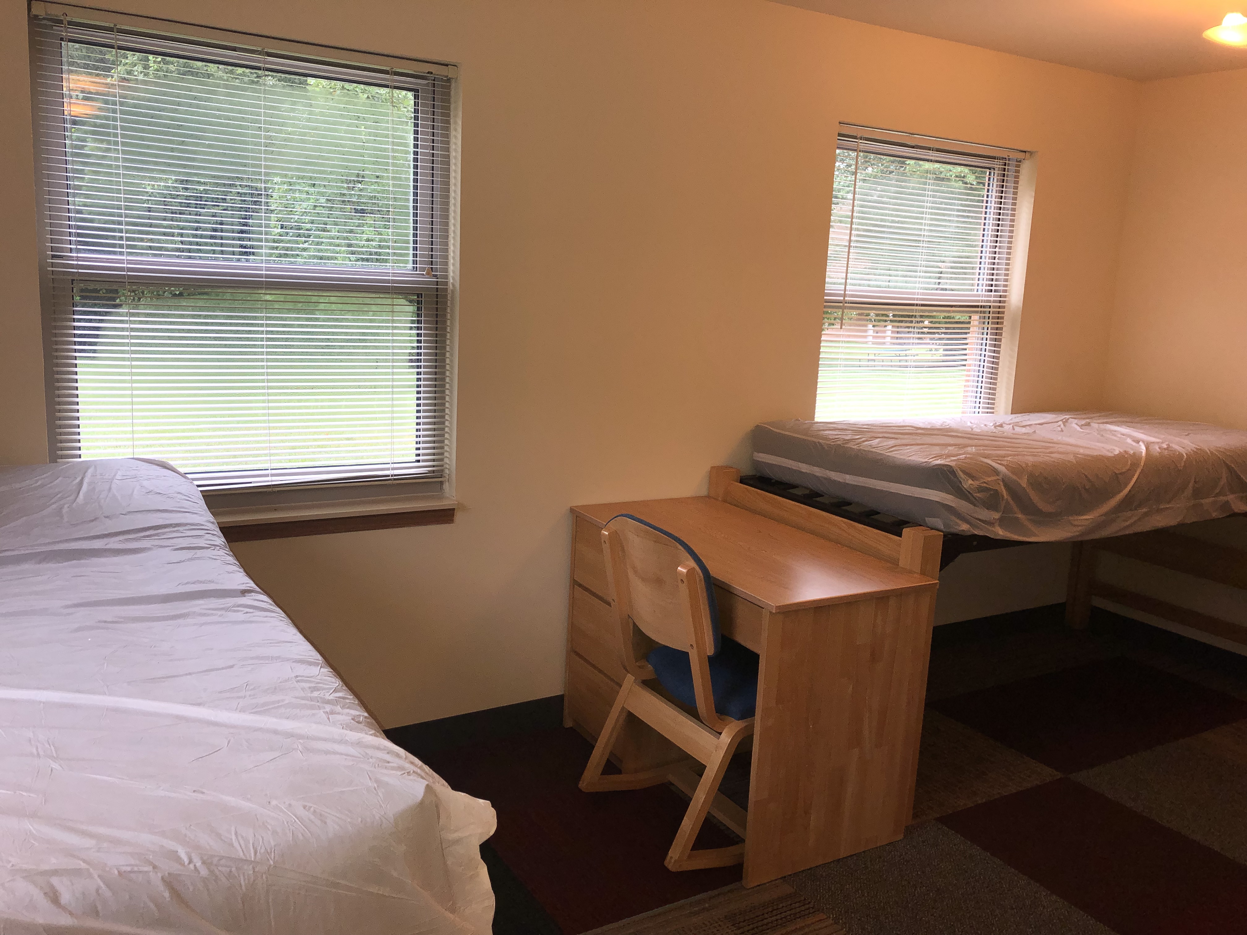 Note that the kitchenette, common room and bathrooms are the same as a two bedroom four person suite. The difference is there are four windows in one bedroom.