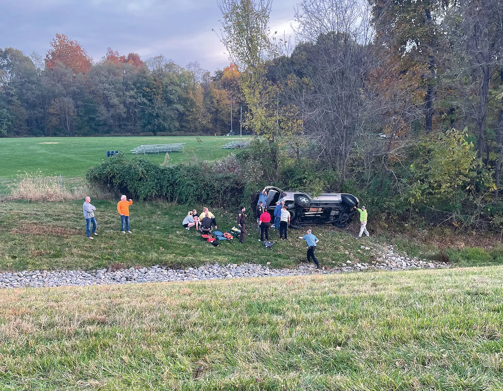 Suddenly, the woman woke up and started moving around, destabilizing the car even more. Perry Township Fire Department arrived and used stabilizing jacks to secure the vehicle. “Once the patient was conscious, the nursing student did an amazing job of keeping her calm until we were able to get her out. She stayed with her the whole time, and I was just a liaison,” says Devillez, who helped pass medical instruments to Conley, including a neck stabilizing pillow and a pair of sheers she used to cut the seatbelt off the woman to help free her airway. Conley was also able to help get the seats folded down inside to aid with extrication.