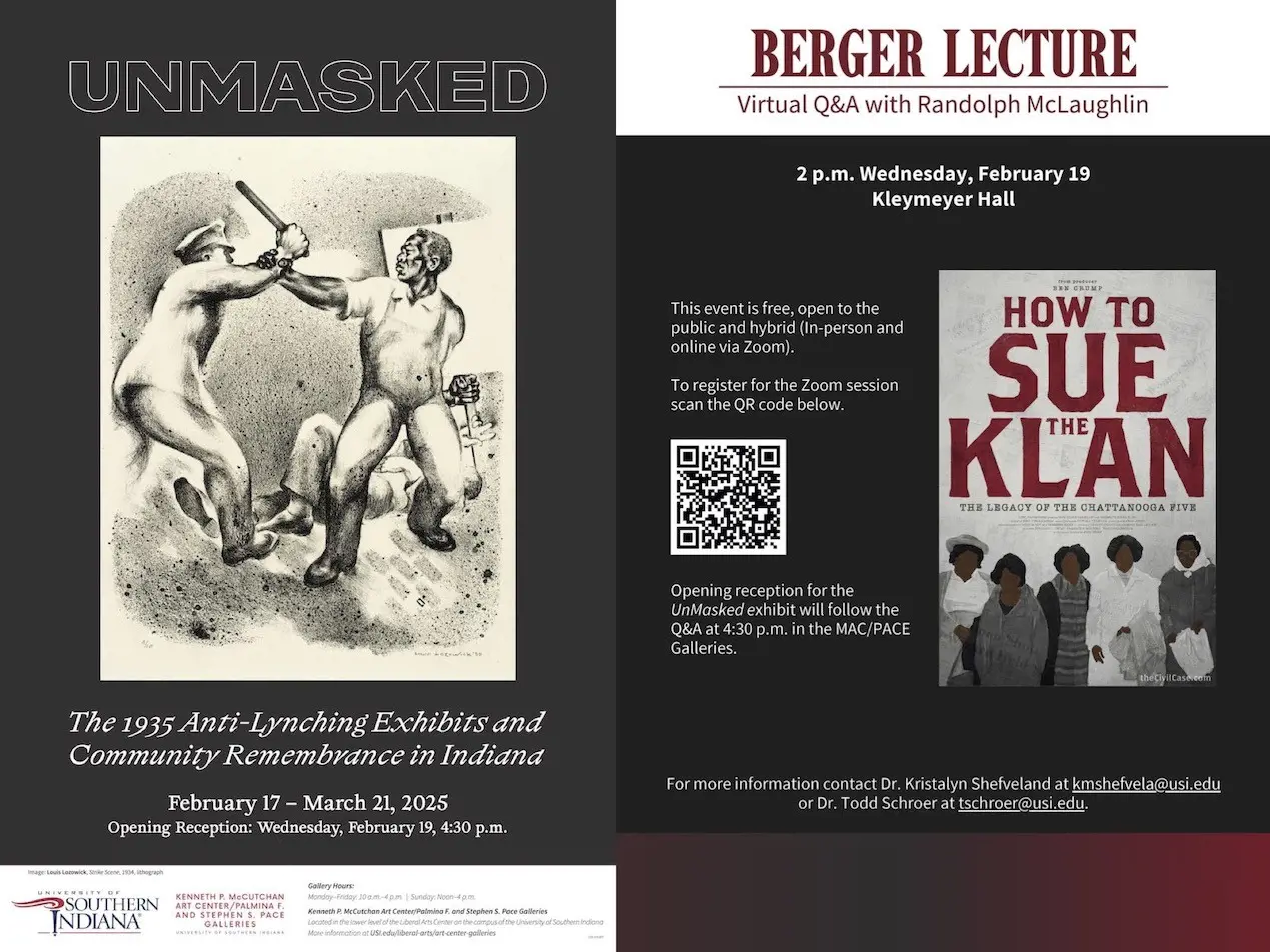 A reception for Unmasked begins at 4:30 pm on Wednesday, February 19, following the 2025 Berger Lecture with Randolph McLaughlin and screening of the documentary film How to Sue the Klan. Light refreshments will be served during the reception. Unmasked curator Alex Lichtenstein and USI Professor Kristalyn Shefveland will be available for questions about the exhibit during the reception. The lecture and film start at 2p.m. on the 19th in Kleymeyer Hall with the reception following afterwards in the McCutchan Art Center.
