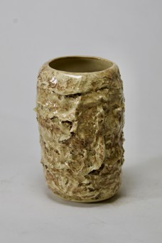 In creating this vase, I focused on building up the surface with repeated layers and textures that mimic the structure of the nest. My process involved shaping the clay into a cylinder. Then I shaped and altered the clay to form an uneven surface. I then built layers of the nest by adding ripped paper towel strips that were dipped in a bonding adhesive for clay. The paper towel strips become a part of the clay. The physical process of working the clay and adding layers of clay allowed the form to develop organically. After the bisque firing or first firing, I painted the vase with a sponge so that the texture and color would resemble a