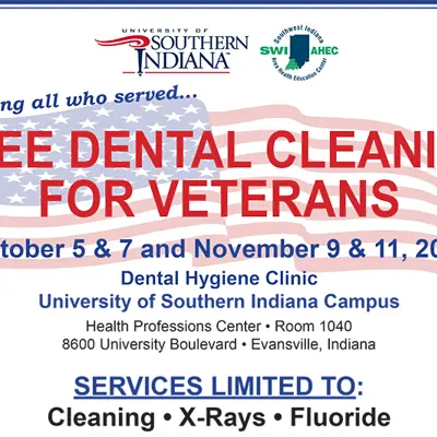 The University of Southern Indiana Dental Hygiene Clinic will provide free dental cleaning, fluoride and X-rays for military veterans on October 5, October 7, November 9 and November 11 (Veterans' Day).