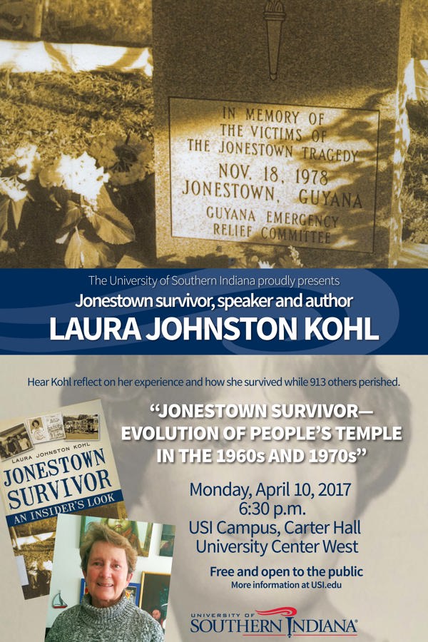 The University of Southern Indiana will host a presentation by Laura Johnston Kohl, a Jonestown Survivor and author of Jonestown Survivor: An Insider's Look, at 6:30 p.m. Monday, April 10 in Carter Hall located in University Center West. The presentation, entitled "Jonestown Survivor - Evolution of Peoples Temple in the 1960s and 1970s," is free and open to the public.