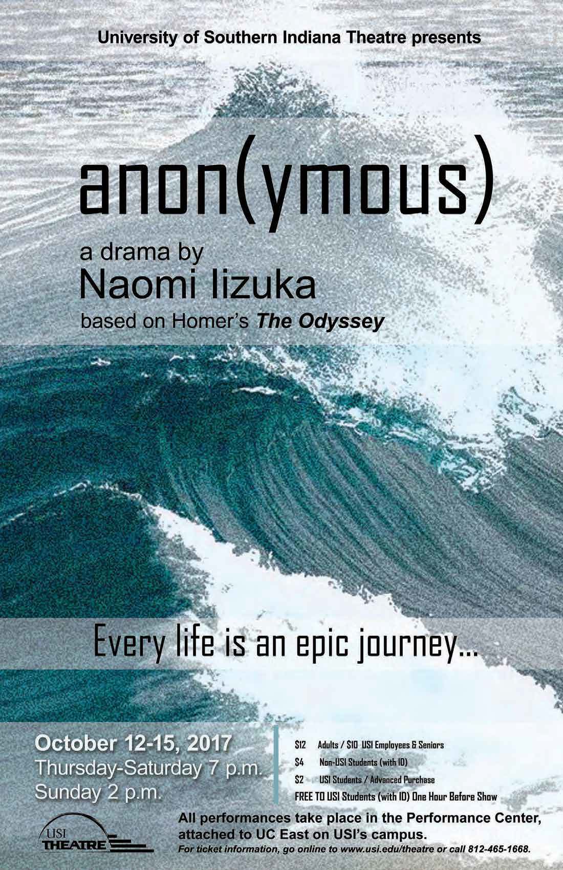University of Southern Indiana Theatre will open its 2017-18 season with the play Anon(ymous), written by Naomi Iizuka. The production runs October 12-15 in the USI Performance Center located in University Center East on USI's campus.