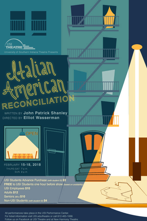 University of Southern Indiana Theatre will continue its 2017-2018 season with the play Italian American Reconciliation, written by John Patrick Shanley. The production runs February 15-18 in the USI Performance Center located in University Center East on USI's campus.