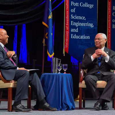On the eve of his inauguration as the fourth president of the University of Southern Indiana, sitting across from General Colin L. Powell, USA (Ret.) on the eve of his 82nd birthday, Dr. Ronald Rochon told a buoyed crowd inside the freshly-opened Screaming Eagles Arena that it was a night he would never forget.