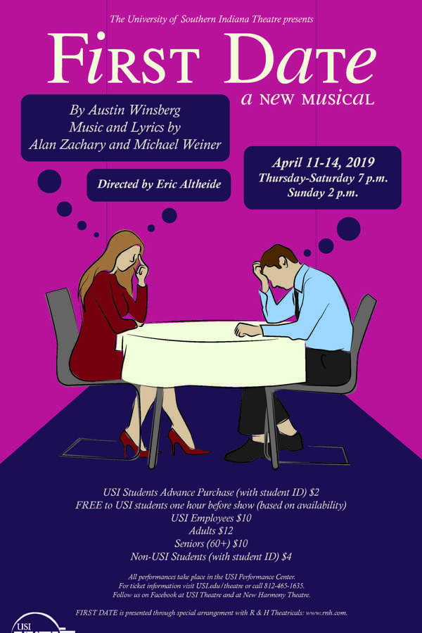 University of Southern Indiana Theatre will finish its 2018-2019 season with the new musical comedy First Date, based on the book by Austin Winsberg, who also adapted the book to the musical. Music and lyrics are by Alan Zachary and Michael Weiner. Orchestrations are by August Eriksmoen and vocal and incidental music arrangements are by Dominick Amendum. The original Broadway production was produced by Junkyard Dog Productions, Stem Productions, Altar Identity Studios, Alex and Katya Lukianov, Susan and Jim Blair, Linda and Bill Potter, in association with Yasuhiro Kawana, Vijay and Sita Vashee, Kevin and Lynn Foley, Jeff and Julie Goldstein, Edward and Mimi Kirsch, Frank and Denise Phillips, Steve Reynolds and Paula Rosput Reynolds, Land Line Productions, Alhadeff Family Productions/Sheri and Les Biller, Pat Halloran/Laura Little Theatrical Productions, Tony Meola/Remmel T. Dickinson and John Yonover, ShadowCatcher Entertainment/Tom and Connie Walsh. The production runs April 11-14 in the USI Performance Center located in UC east on USI's campus.